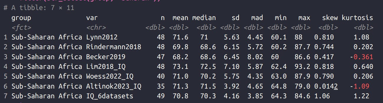 But ideology alone cannot sustain itself indefinitely. It requires the appearance of evidence. Enter Richard Lynn’s “National IQ” dataset, which purports to rank countries by average intelligence. This dataset, first published in 2002 and updated several times (most recently in 2023), is now maintained by David Becker at the Ulster Institute for Social Research and contains 660 studies spanning 130 countries. It is cited by every major proponent of human biodiversity. The dataset is also garbage. Not flawed, but still useful garbage. Not rough, but directionally correct garbage. It is the kind of garbage that, upon close inspection, can only make sense in the shadow of the ideological project standing behind it.