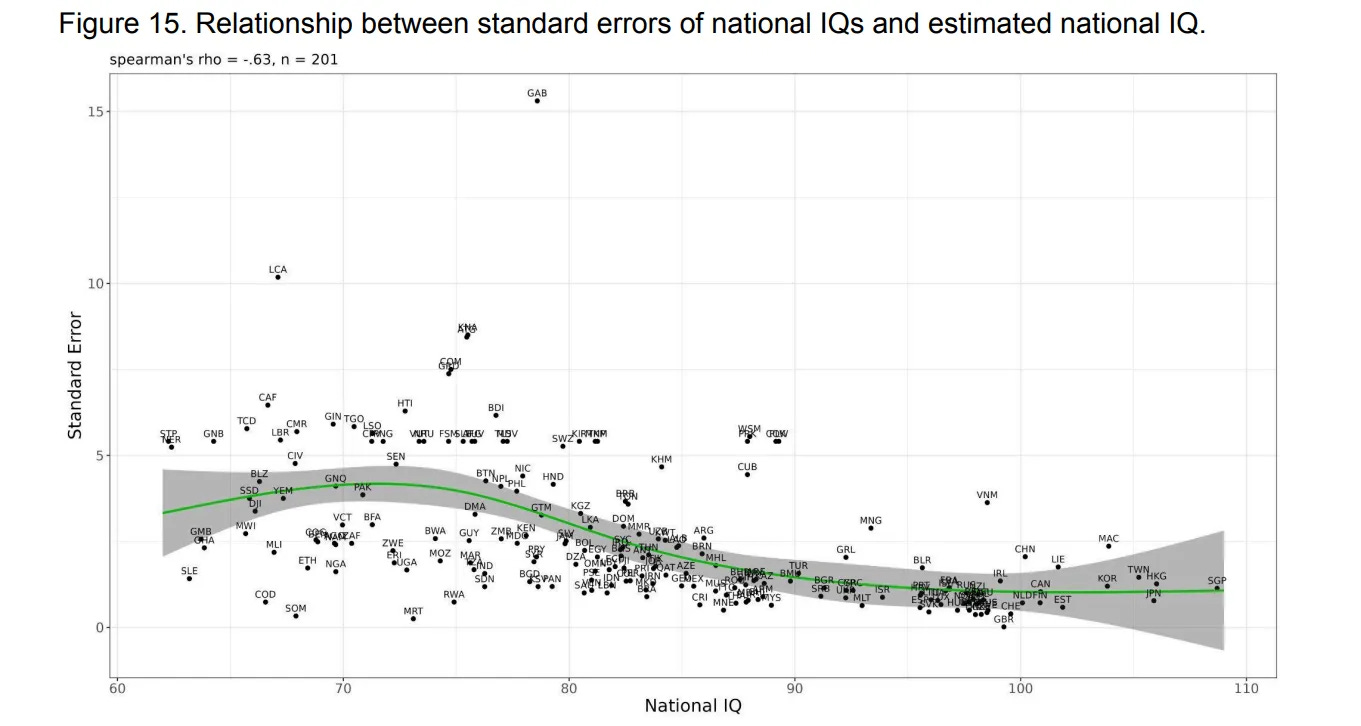 The rest of her post concerns nitpicking low quality data from various countries of American political relevance (e.g. Haiti, Somalia). There’s no point in doing this kind of exercise. Everybody knows that poor countries have low data quality. Inquisitive Bird has a good post on this topic. This is not restricted to intelligence but concerns every datapoint we get from such countries. This is also why researchers are increasingly relying on e.g. satellite data to ascertain the growth of such economies (as well as those from authoritarian regimes that report fake statistics). As such, demanding top quality data is isolated demand for rigor and not generally possible. It doesn’t ultimately matter if Haiti is estimated at 65 or 75 for the worldwide results (it’s a tiny half-island not of much significance). As we can see in the figure above, imposing various different floors make little difference, until we start making the floor so high that real variation is clearly reduced (such as using the floor of 80). Here’s the correlation between data quality (estimated standard error of national IQ) plotted against the countries’ IQ (based on our own work):