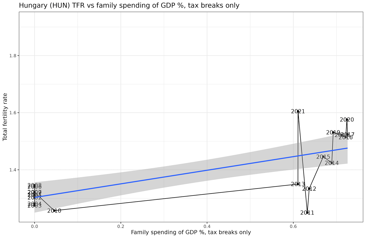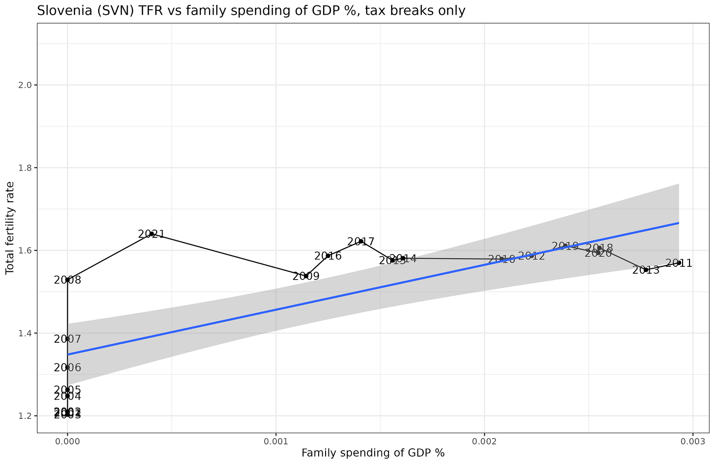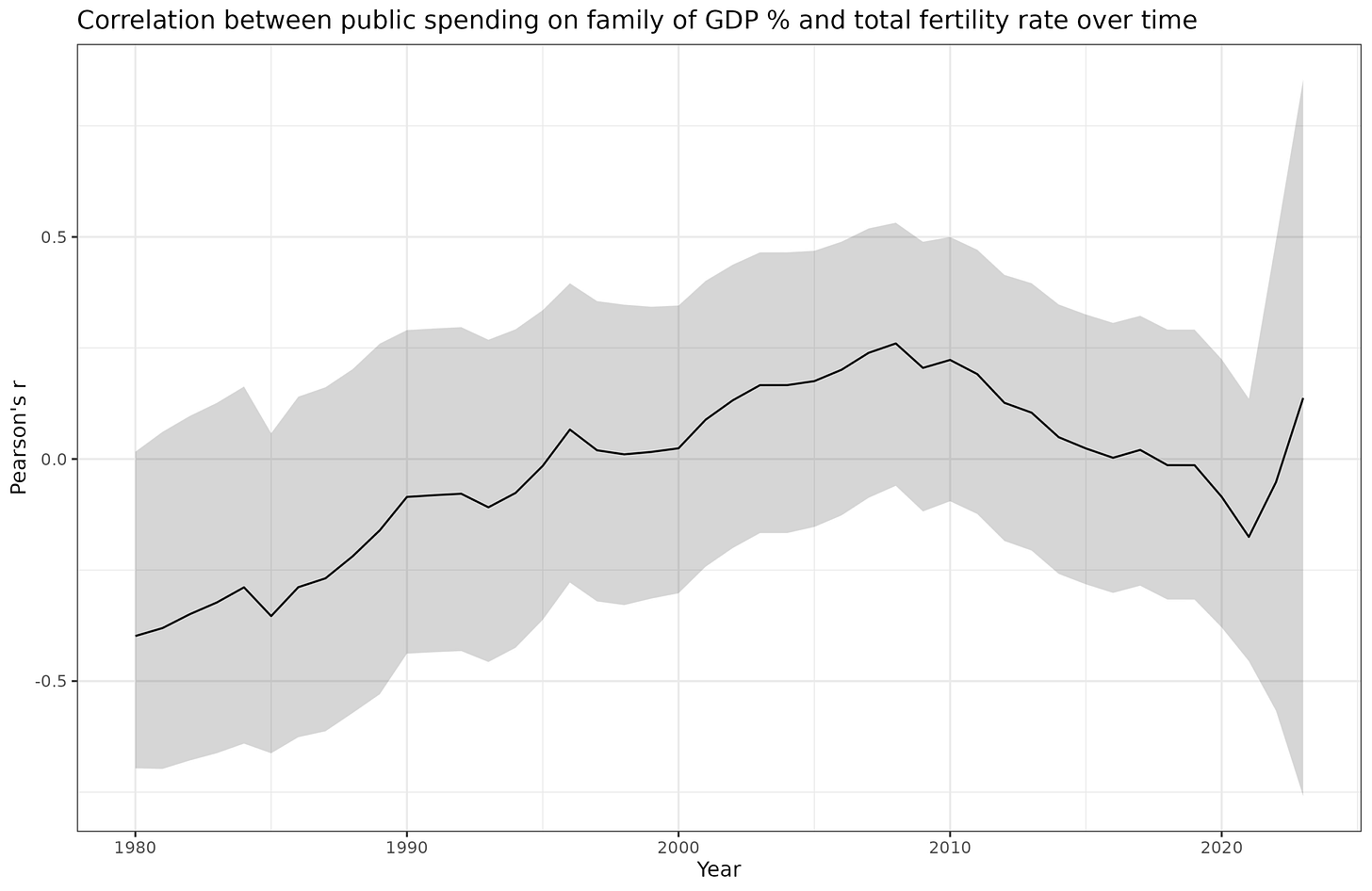 OK, but maybe it takes a while for the policies to have an effect. After all, a pregnancy takes 9 months at least, and it may take a while to decide to try this and get it working. So we can try lagging the values (use previous year’s spending to present current year’s TFR):