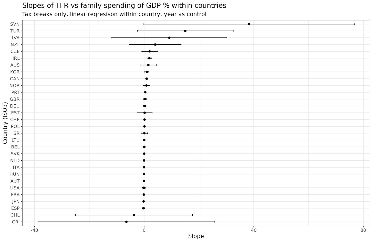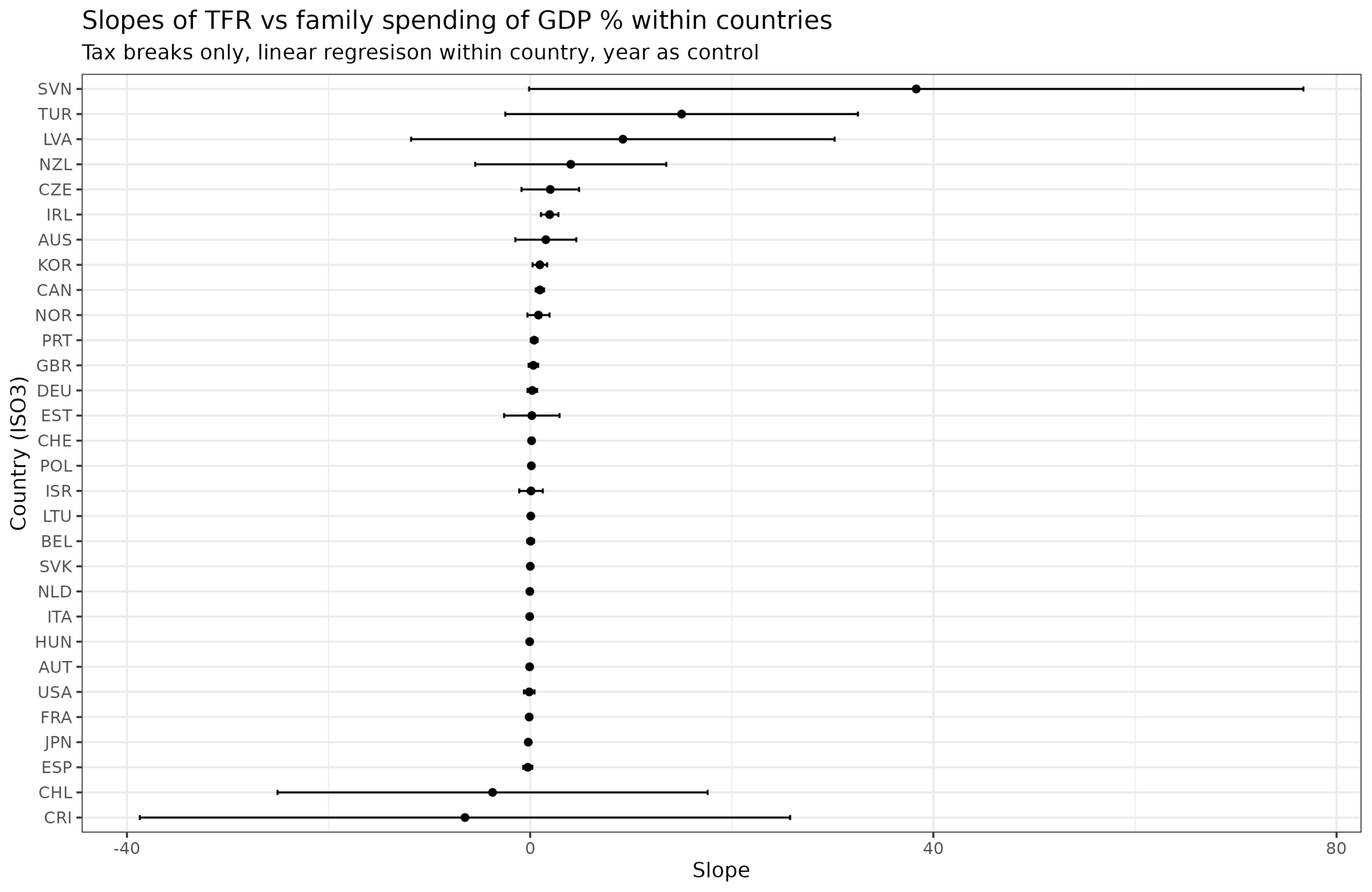It would appear tax breaks for families are awesome. Since this is done using fixed effects for year and country, any confounding factor has to be something that changes over time as well and manages to correlate even better with fertility rates than this variable does.