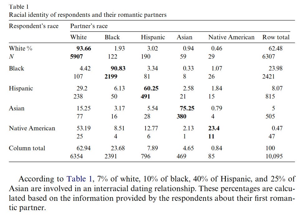 Wang, H., Kao, G., & Joyner, K. (2006). Stability of interracial and intraracial romantic relationships among adolescents. Social Science Research, 35(2), 435-453.