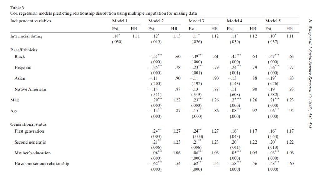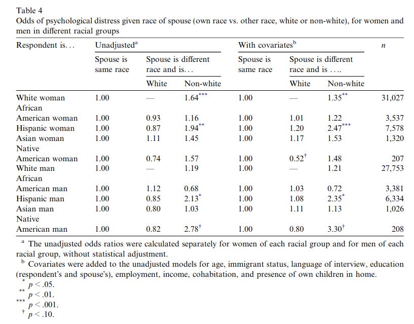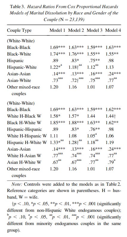 I have written on the children produced by mixed-race couples before, and since it went so well, it's time to try again. Only this time, another angle: the parents themselves. Someone reminded me of research showing that mixed-race marriages are less stable. So I had a look at the literature, tweeting my findings while skimming papers. Here they are in a nicer format. You can find some more studies here. I picked newer, and large studies. The basic finding is that interracial marriages are less stable on average, but it depends on the specific combinations of race and sex. If one controls for stuff, one can make some of the associations 'go away'. Still, a prudent person would think of this as an extra risk factor, and avoid it insofar as this is possible. There is no difference here with avoiding other risk factors, such as a spouse with mental illness diagnoses. So this post isn't advocating a ban on interracial marriage anymore than it is advocating banning mentally ill people from marrying. Yet somehow I get the feeling it will be deliberately interpreted that way.