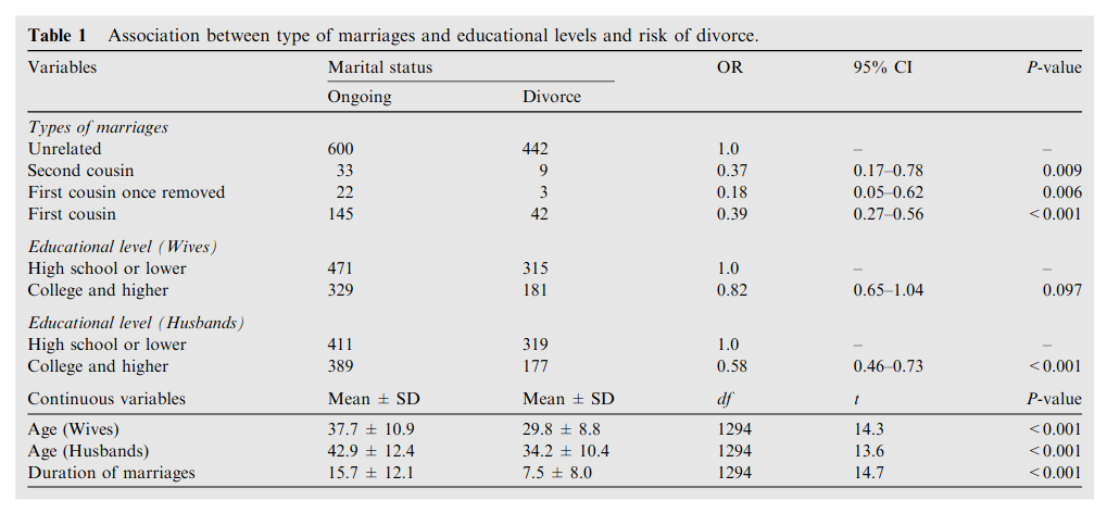 Islam, M. M. (2021). Consanguineous marriage and its relevance to divorce, polygyny and survival of marriage: Evidence from a population-based analysis in Jordan. Annals of Human Biology, 1-23.