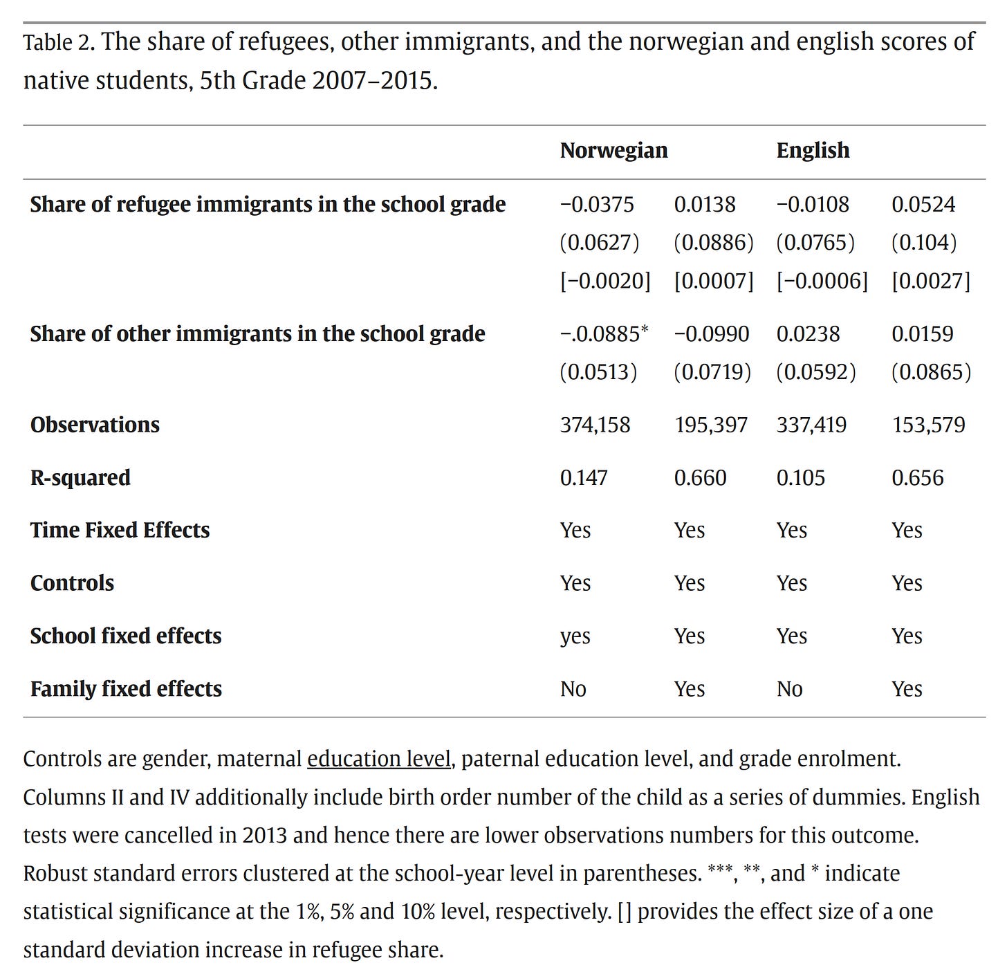 When migrants come in, they end up in certain schools and their peers (classmates) tend to have below average performance. Is that caused by the new arrivals, or were their performance below average to begin with? It turns out it is selection. Granted, the unadjusted effect sizes were tiny to begin with, so it wasn't of much relevance to begin with: