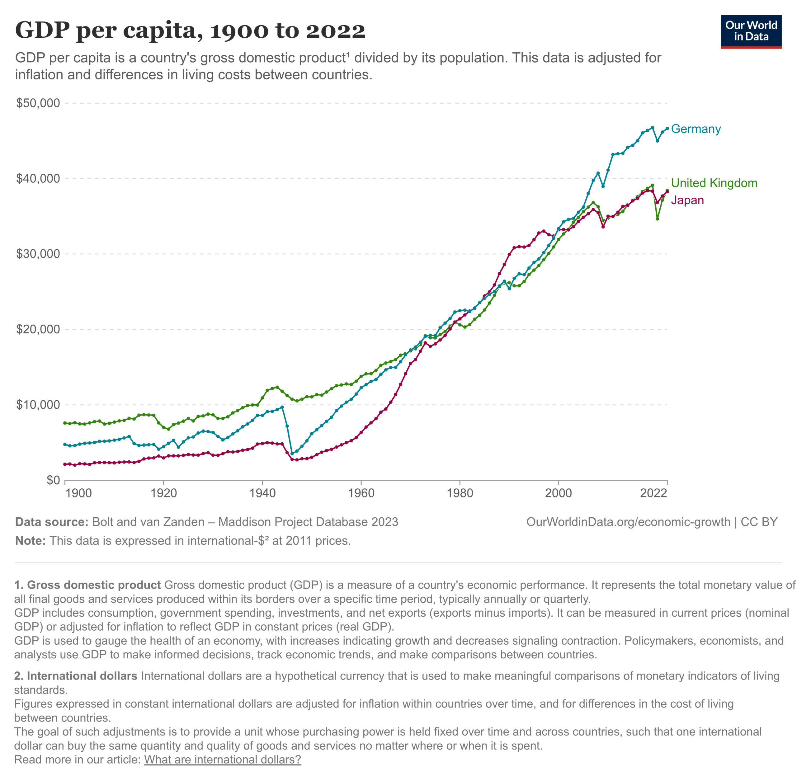 If you look closely, you can see UK and Germany dipped in the WW1 years (1914-1918), and Germany more so during the WW2 years and it’s aftermath (wartime GDP numbers are dubious). Nevertheless, if we look we can see that it took Germany only 11 years to reach back to their 1945 value (in 1956), and a few years later they have caught up to where they would have been. In fact, they overtook the UK, though perhaps because this is West Germany only (East Germany is poorer). These data do not fit with the Marshall plan working, as Germany received less aid but had more growth than the UK. If anything, this might suggest getting your country bombed to ruins is a Good Thing for economic growth. I mean, it is if one only looks at the effects afterwards since growth rates will accelerate until one returns to the long-term stable trajectory for that country.