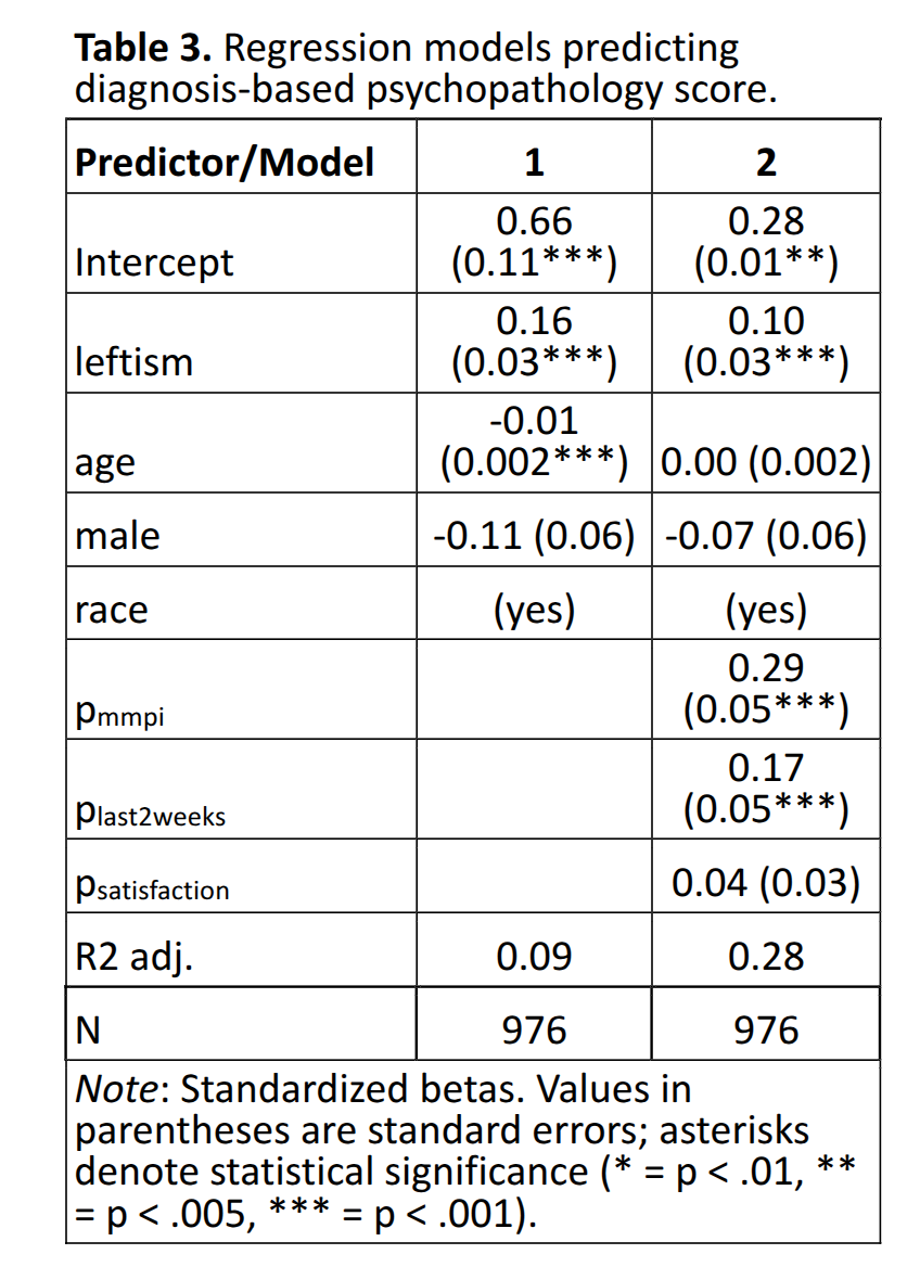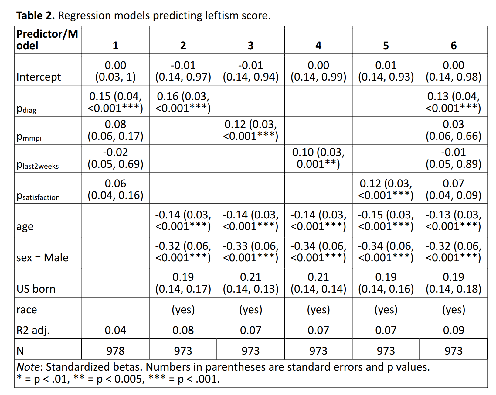 The answer is no, not only, but maybe in part. Diagnoses correlates 0.20 with leftism but 0.16 controlled for age, sex, US-born, and race (though the CI overlaps with 0.20). More interesting is that the models that include both self-report measures and diagnoses counts, the diagnoses have the signal and the others turn non-significant (but stay positive). With ~1000 people, we can’t say whether diagnoses count mediates the entire effect but possibly. One could even try controlling for self-reported mental problems and see if leftism still predicts diagnoses: