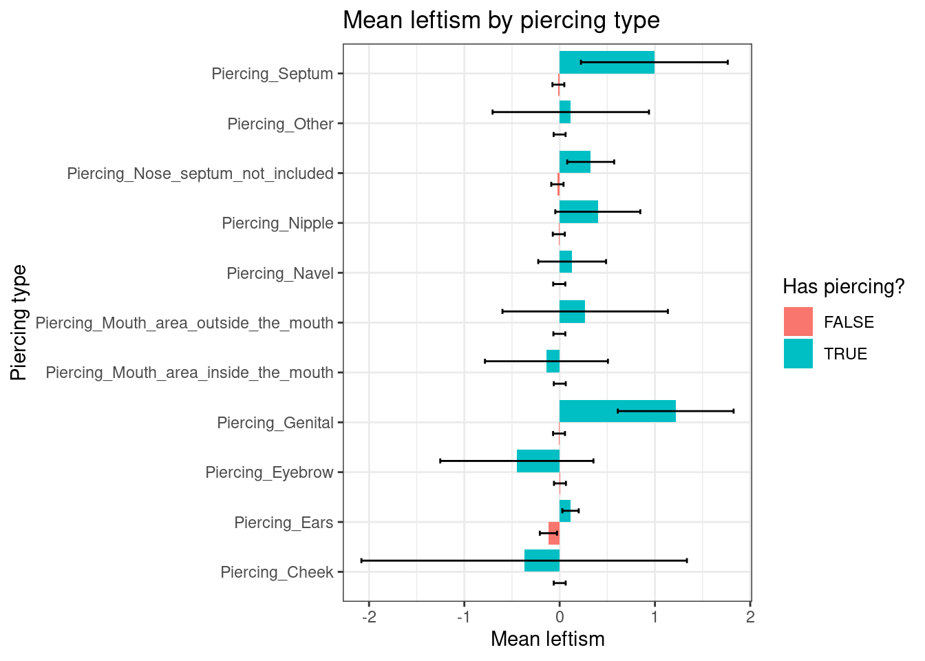 It turns out that controlling for age, sex, and race, tattoos and piercings don’t predict leftism, but unnatural hair color does, as does diagnoses. However, for predicting mental diagnoses, tattoos work while piercings and unnatural hair color does not, with or without including leftism as a predictor. Thus, the adept stereotyper would have to remember that unnatural hair color is particularly indicative of leftism, while tattoos are particularly indicative of poor mental health.