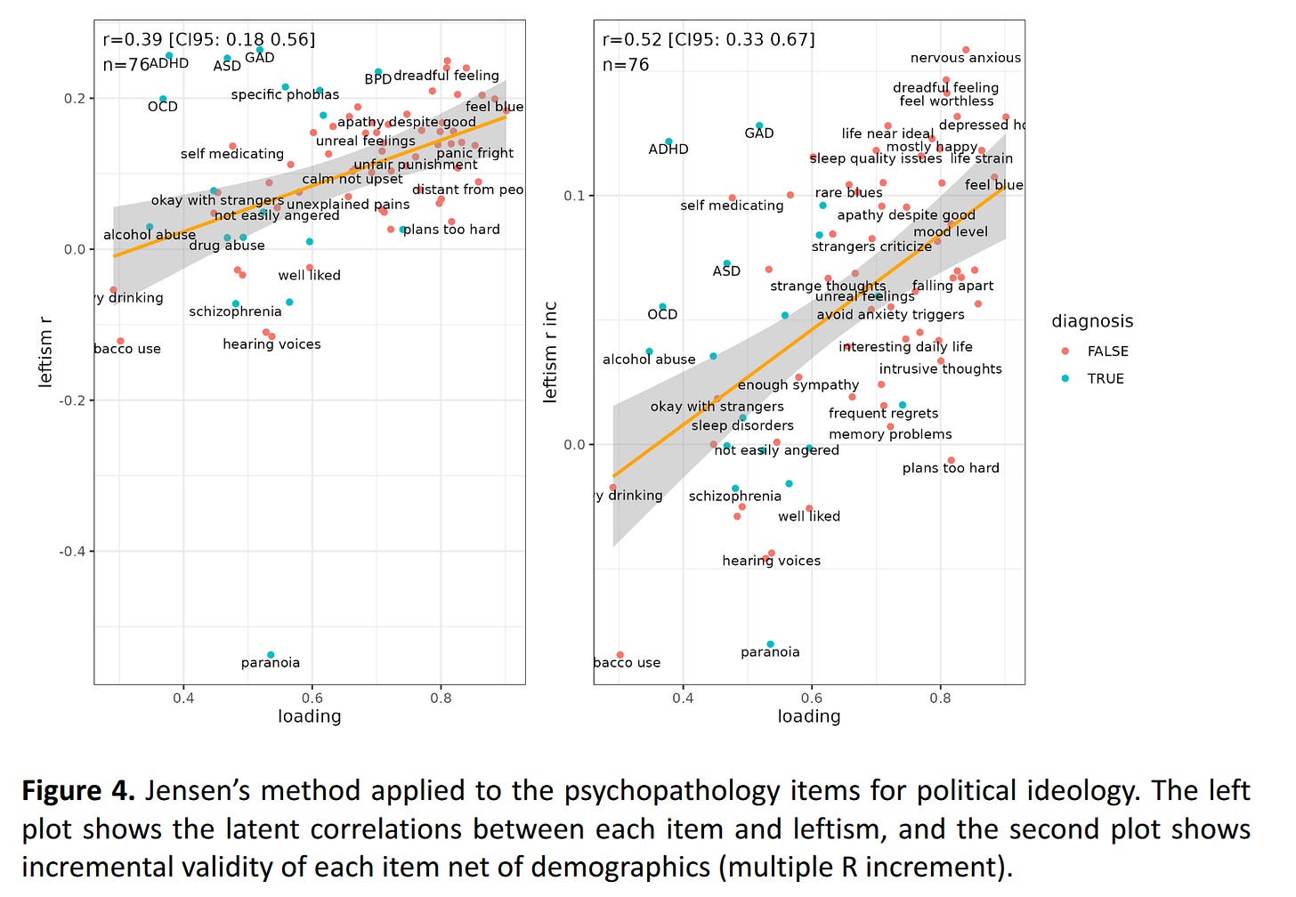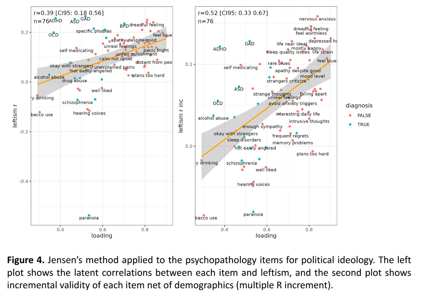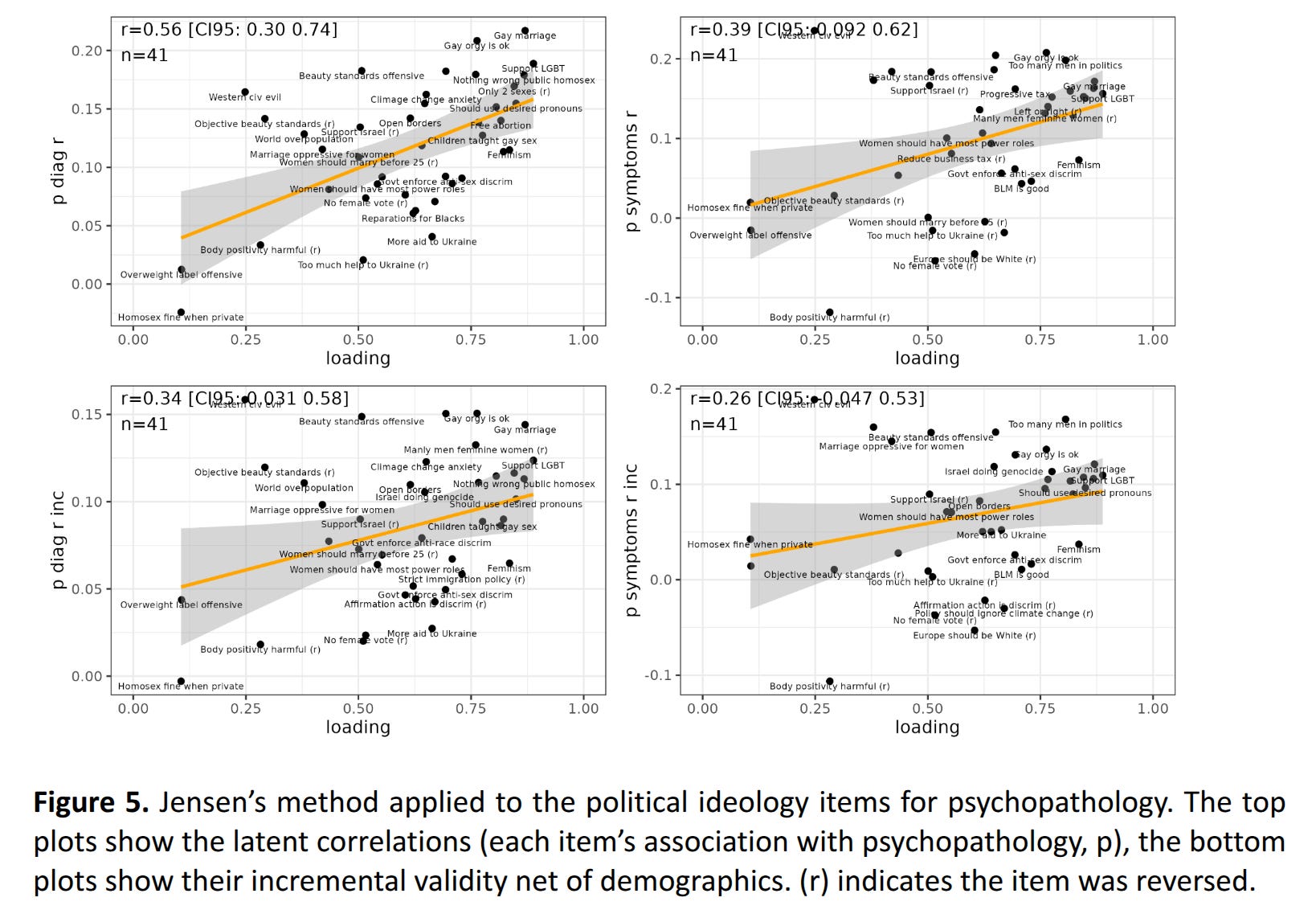 And yes, diagnoses still predict but at about half the strength as the raw link (0.10 vs. 0.20). As a first step into measurement invariance testing, we can check whether the questions that better measure overall psychopathology predict leftism better as well (Jensen’s method):