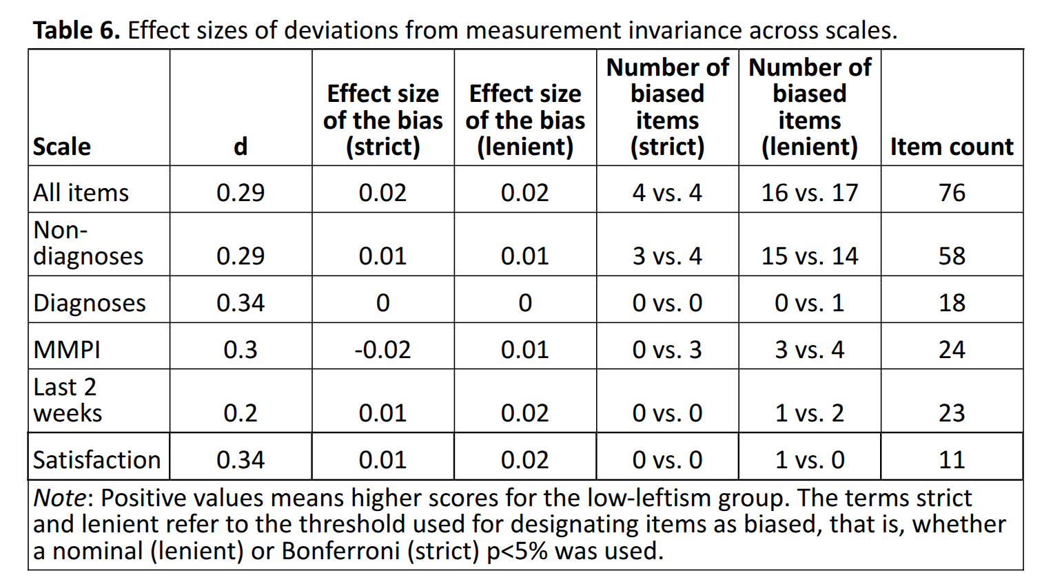 We didn’t find much evidence of directional bias in the measurement, no matter how the mental health questions were scored (separately by scale, mixed). There were many biased items but they were roughly evenly balanced, as is typical.