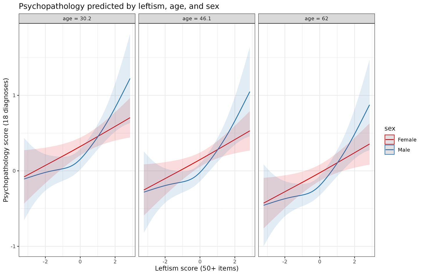 The purpose of the study was mainly to check the measurement invariance of the relationship, since many people had doubted this. Perhaps leftists are just more likely to see therapy or maybe they fill out questionnaires differently. For this reason, we went a bit overboard with the mental health measurement having 76 questions, 18 concerning specific diagnoses and the remaining the more commonly used self-report questions about various aspects. Politics was measured using 41 questions concerning various current thing political questions for Americans, and scored just using the 1-factor model. (Yes, one can extract other dimensions but this one is dominant.) General results: