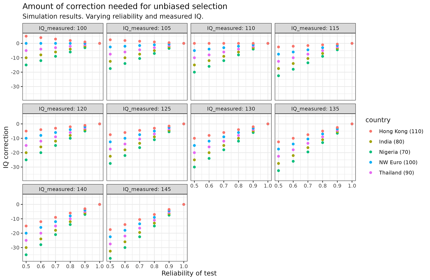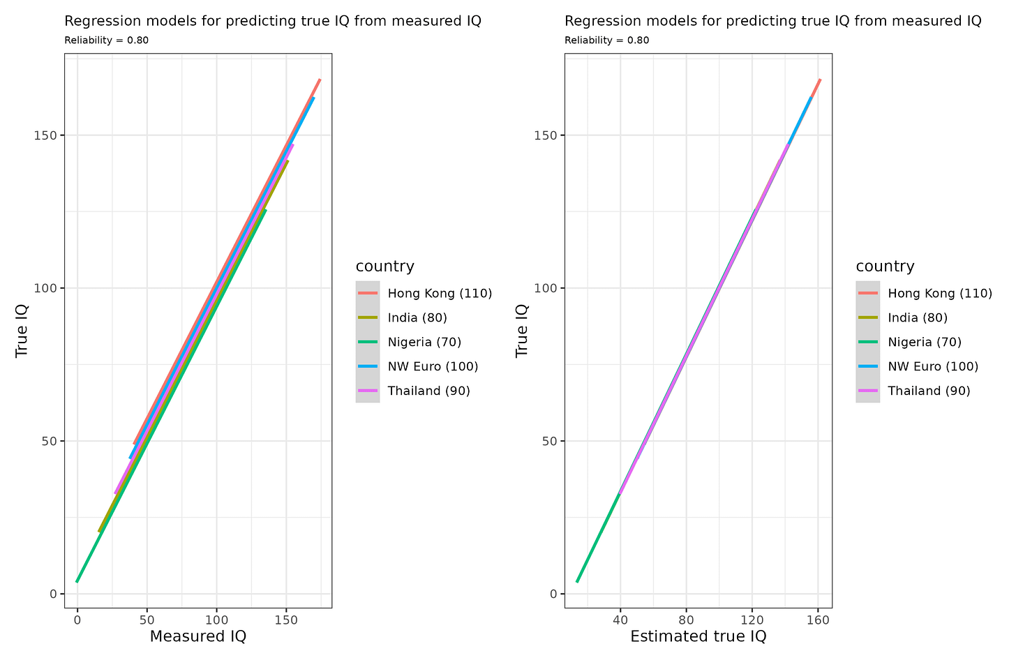 The somewhat complex plot shows us which value we have to add from the measured IQ to adjust for the unreliability and differences in group IQs. In other words, the amount of regression towards the mean to apply. Thus, we see that if the group IQ mean is actually above the measured value, we must add a bit: top left plot for Hong Kong, if we have reliability = 0.5 (poor), and see 100 IQ, we should add 5 to get a best estimate of 105 IQ. In the case of extreme cases where we see 145 IQ with a standard 0.80 reliability test, we need to subtract 7 IQ if the person is from Hong Kong but 15 IQ if they are from Nigeria. Doing so in both cases will result in unbiased estimates of these bright people of 130 and 138 IQ.