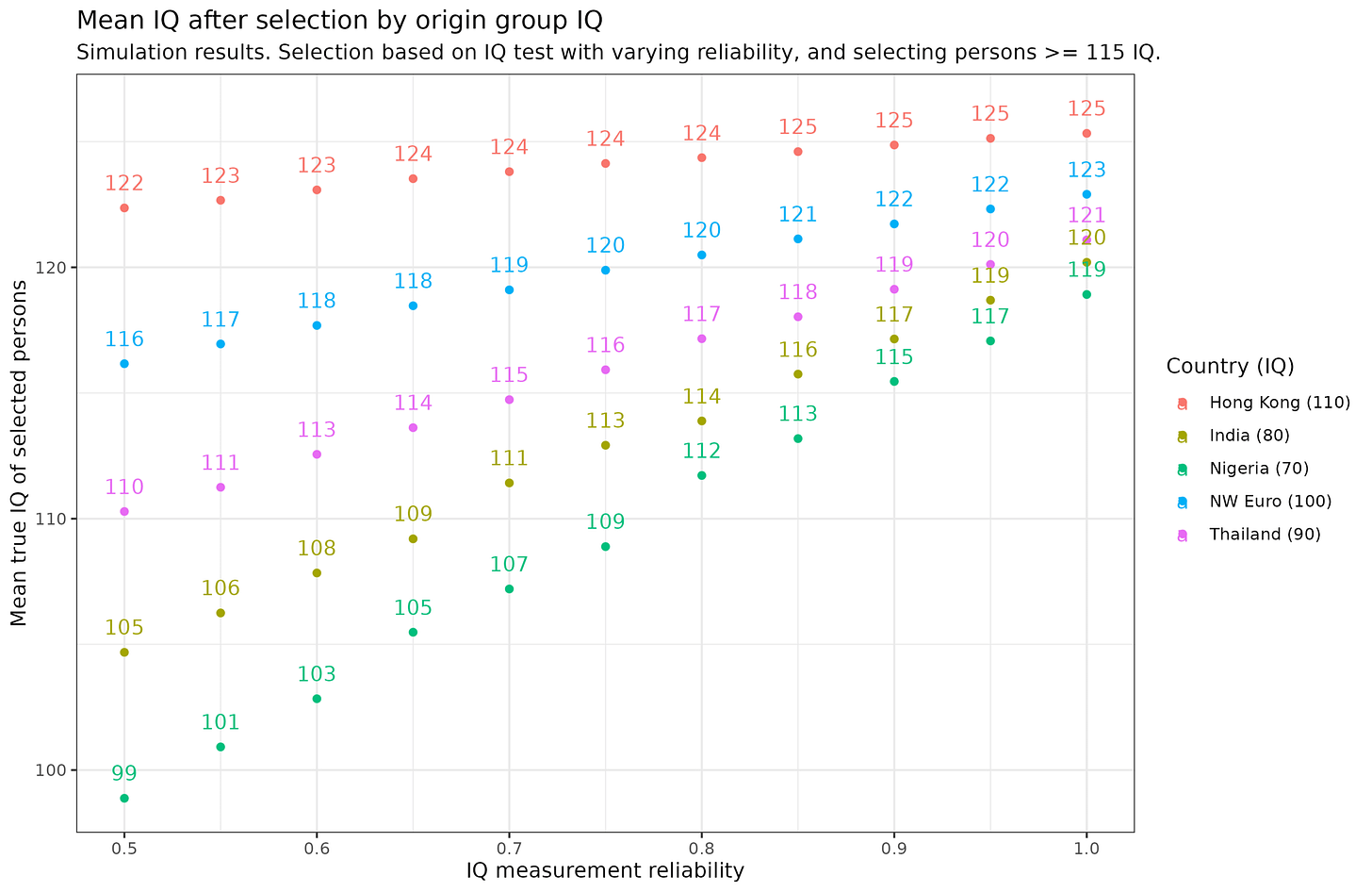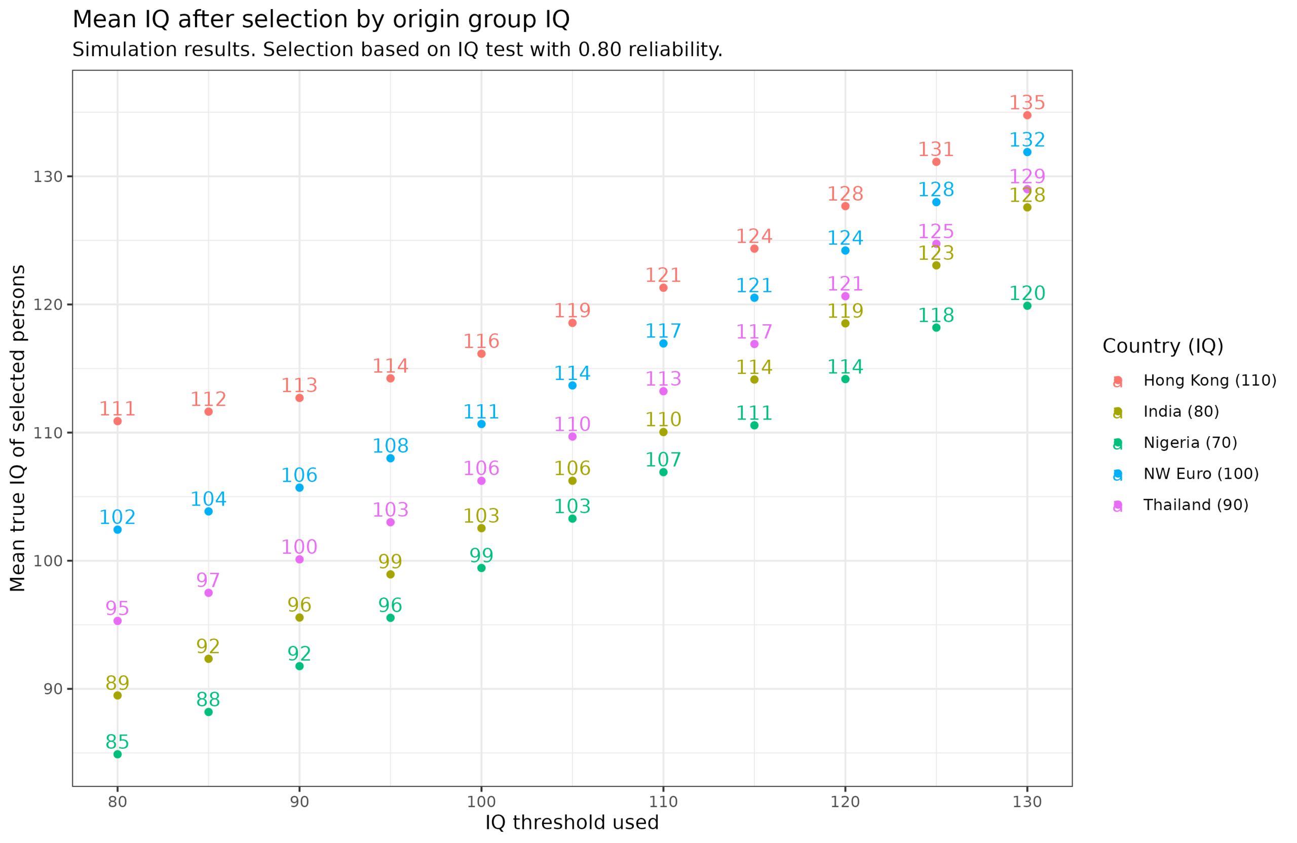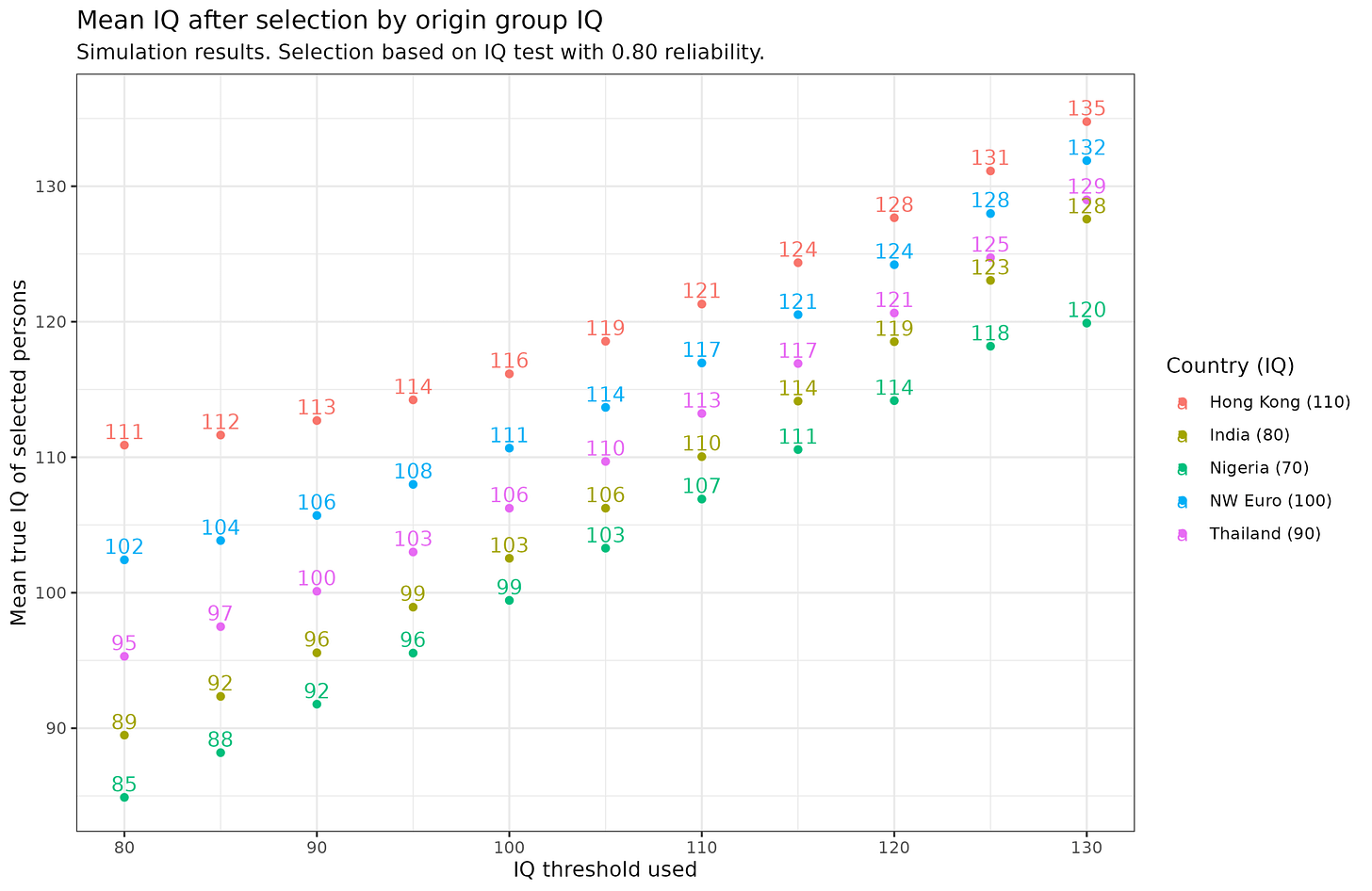 Here we assume the test has a reliability of 0.80, which is around the value of a decent but practically short test for this kind of situation (like a group-administered nonverbal test). The IQ threshold varies from 80 to 130, depending on the hypothetical system you are considering to use. The plotted values show the true IQ means of the people admitted as a function of the threshold applied to the measured IQs and the country or region of origin (with plausible values). We can note a few things. First, no matter the threshold used, the groups have the same rank order before and after the selection event (this fact confuses many people). Second, the gaps are larger when a lenient threshold is used and smaller if a stringent one is used. Third, the same threshold applied to different origin populations does not lead to the same human capital in the selected persons. As a matter of fact, doing no selection at all results in 110 for Hong Kong (their national mean) but you have to apply a threshold of 115 to get Nigerians with the same mean, 110 for Indians, 105 for Thai, and 100 for NW Europeans.