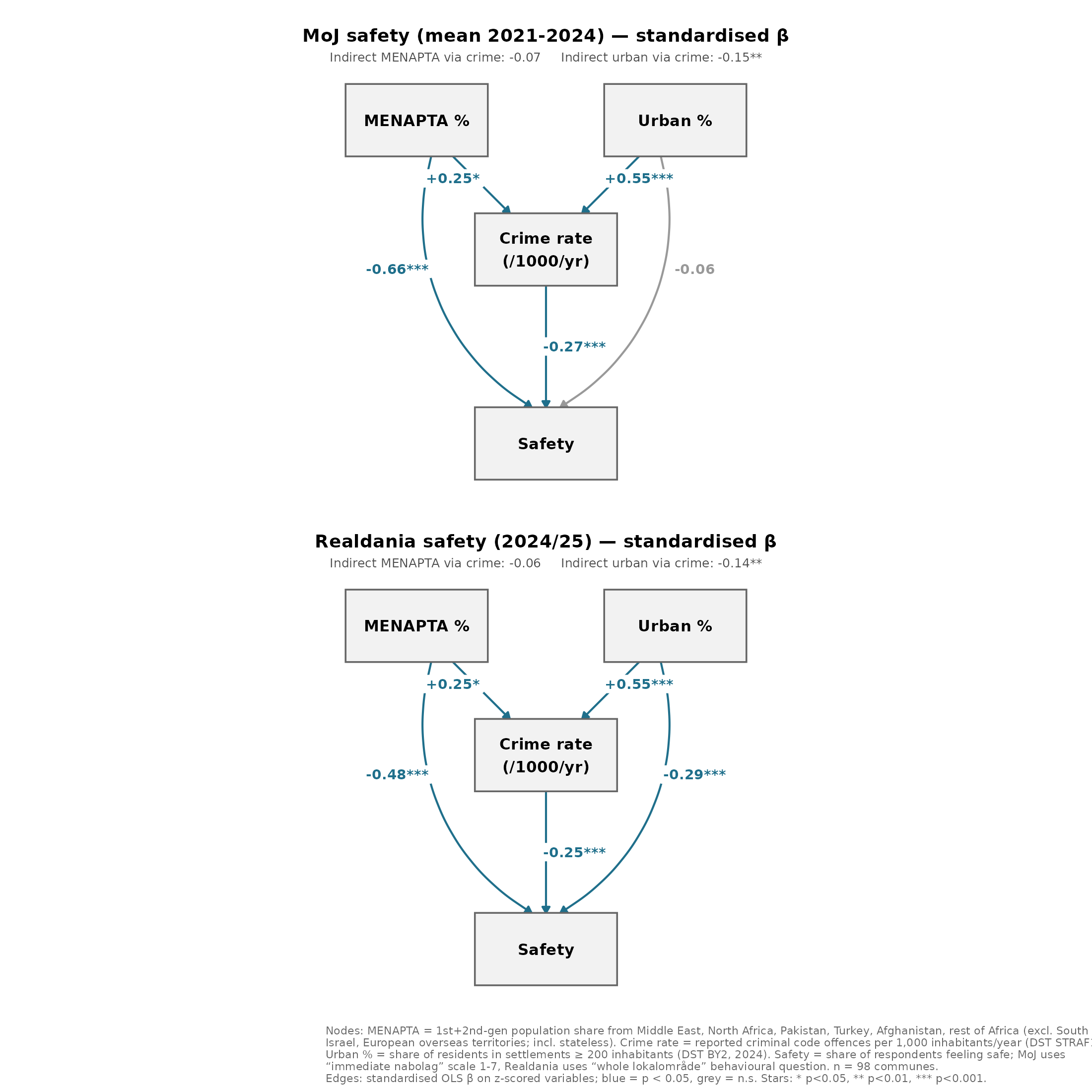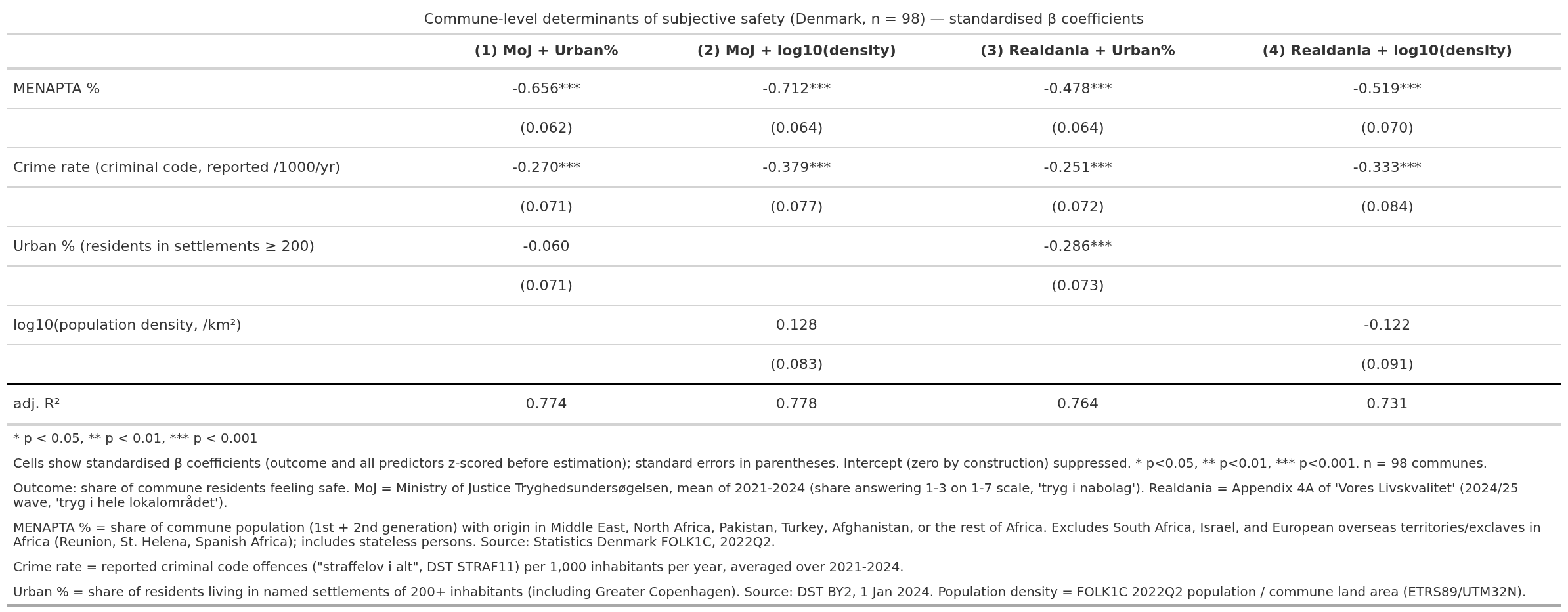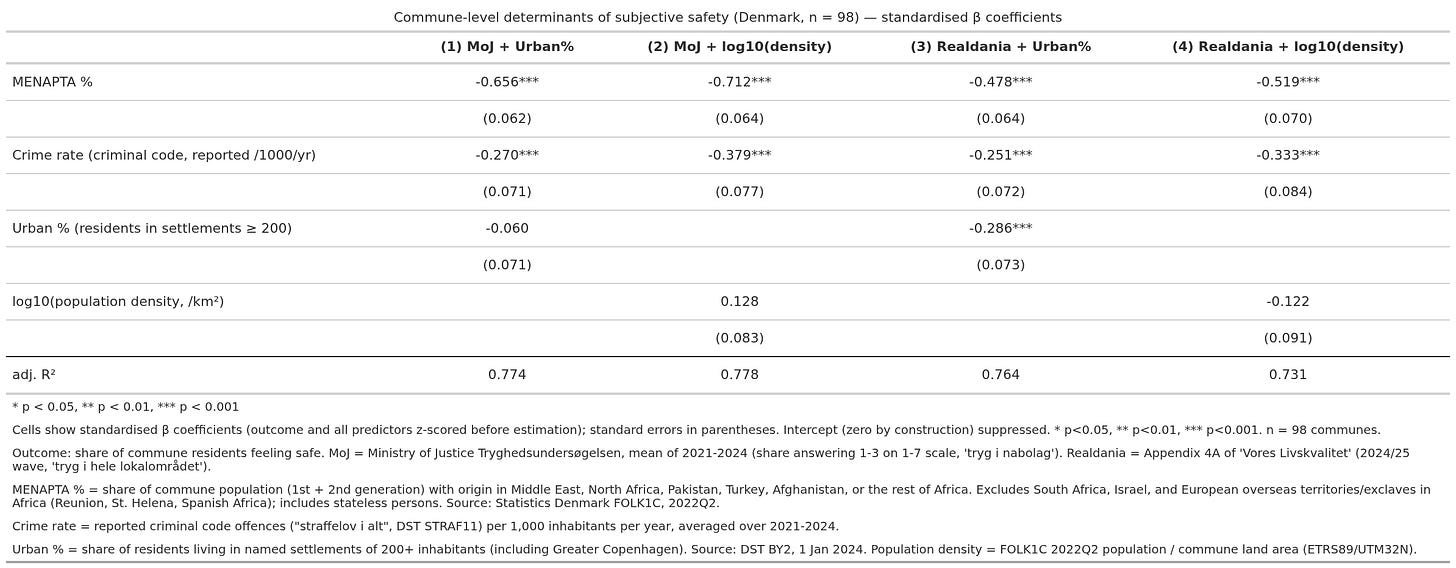 Using either urbanization (% of population living in settlements of 200+ people) or population density does not materially change the results for MENAPTA% as a predictor. They are weaker using the Realdania dataset, perhaps because they asked a different safety question: