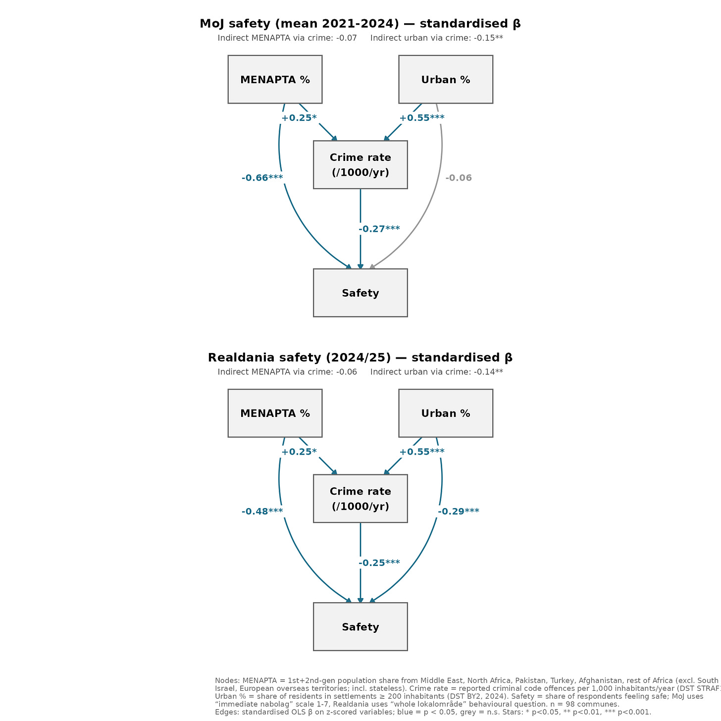 In this way, we can see that given this plausible causal model, the effect of MENAPTA on subjective safety is ~90% direct, not mediated by the crime rate. This may be somewhat puzzling. If people’s feelings of safety relate to reality, they should also mainly be a function of antisocial behavior as proxied by the crime rate. This could be because 1) some crime or antisocial behavior is not captured by the crime rate e.g. under-reporting, ‘new normal’, or behavioral adaptation (you don’t feel unsafe because you no longer think about walking home alone at 2 am), or 2) these peoples just feel less safe in general and the effect we see is mainly a composition effect. Prior research has frequently found that such compositional effects are large. Whites in USA report higher interpersonal trust levels no matter where they live. One review included this summary: