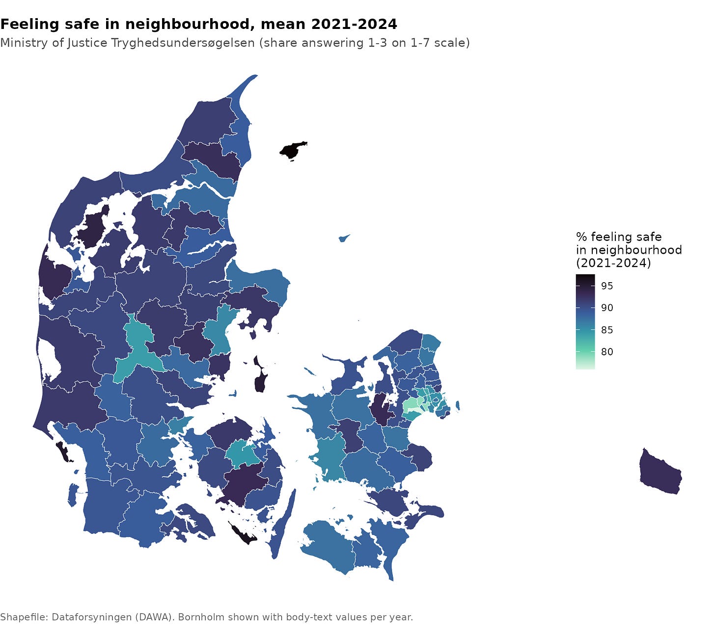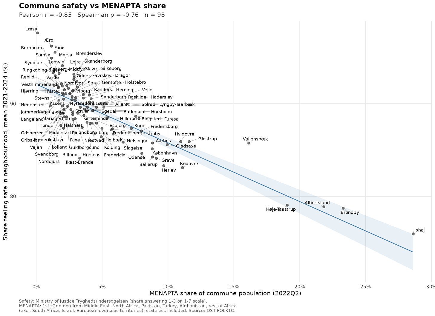 A politician from the Social Democrats called Frederik Vad (center-left government party) posted results of a survey about how safe citizens report feeling in various areas of the country. There is an obvious association with ethnic Danish% in the areas and high reports of safety (tryghed). He didn’t post the scatterplot and the report didn’t even include the data in the appendix (seemingly by mistake). I computed average feeling of safety for the 98 communes (2nd level divisions akin to US counties, UK local authorities, German Kreis) and fetched the ‘MENAPTA’ middle eastern, north African, Pakistani, Turkish, and African %, including 2nd generation. Yes, the acronym is getting a bit silly, one could instead say AMEPT or some other order to avoid having both “north African” and “African”, but since MENA(P)(T) is the standard acronym here, it made more sense to add (Sub-Saharan) Africa to it than confuse people. Using the Ministry of Justice’s (MOJ) own survey results for the years 2021-2024, we can construct this map of average levels of reported safety: