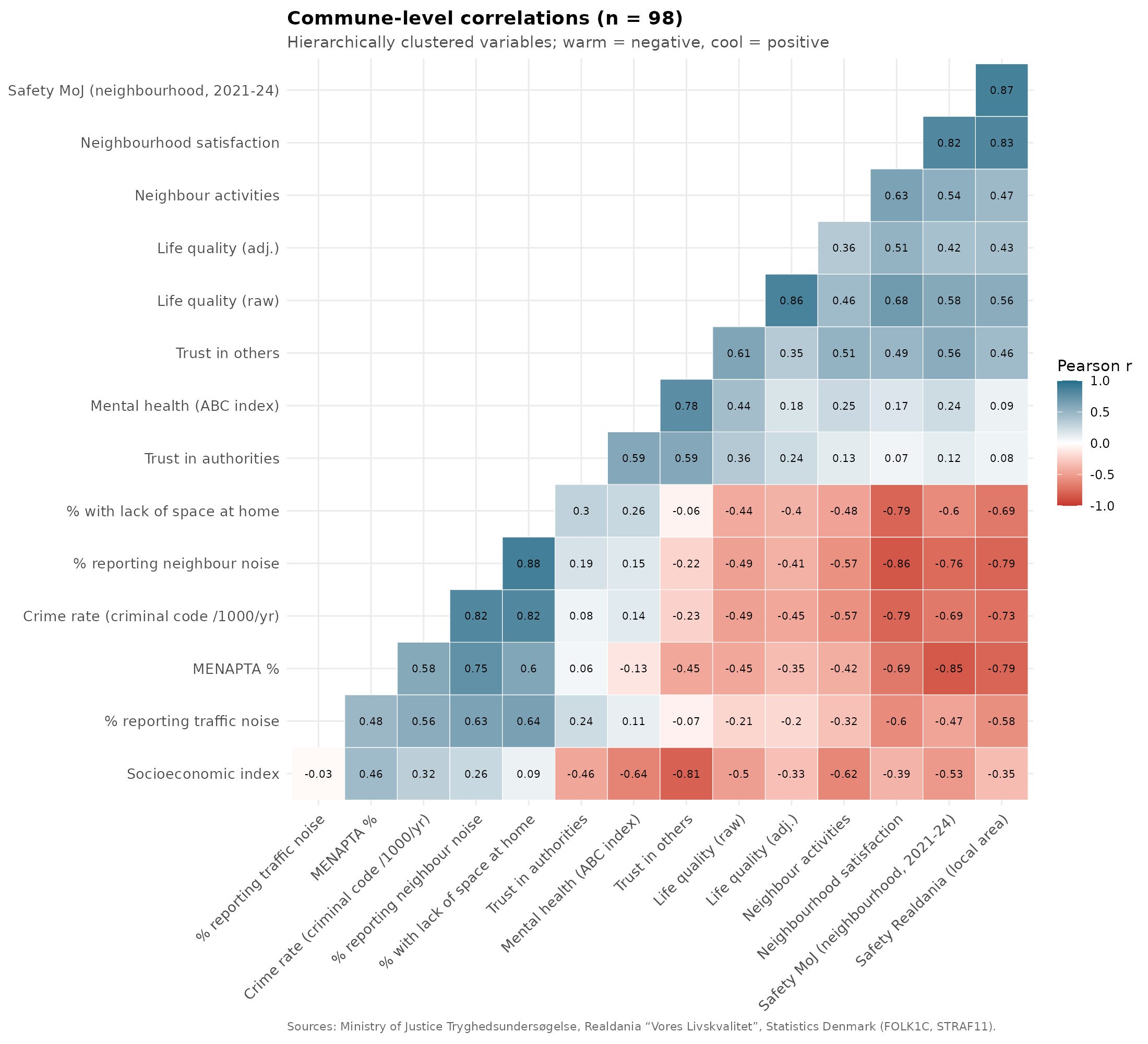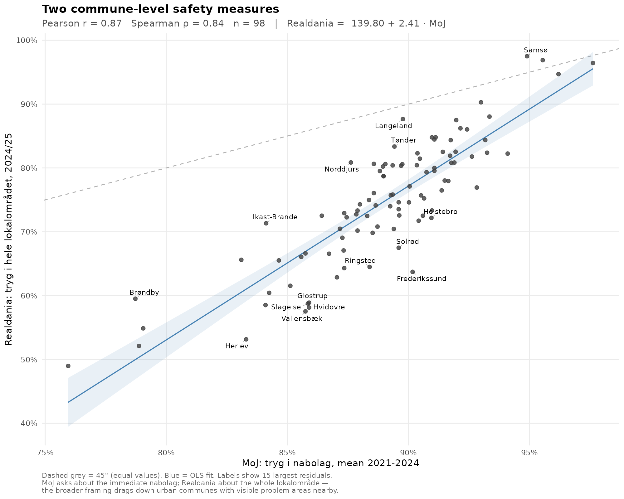 The MOJ variable is more reliable because it is based on 4 years of data versus a single year for Realdania. These two measures are very strongly correlated: