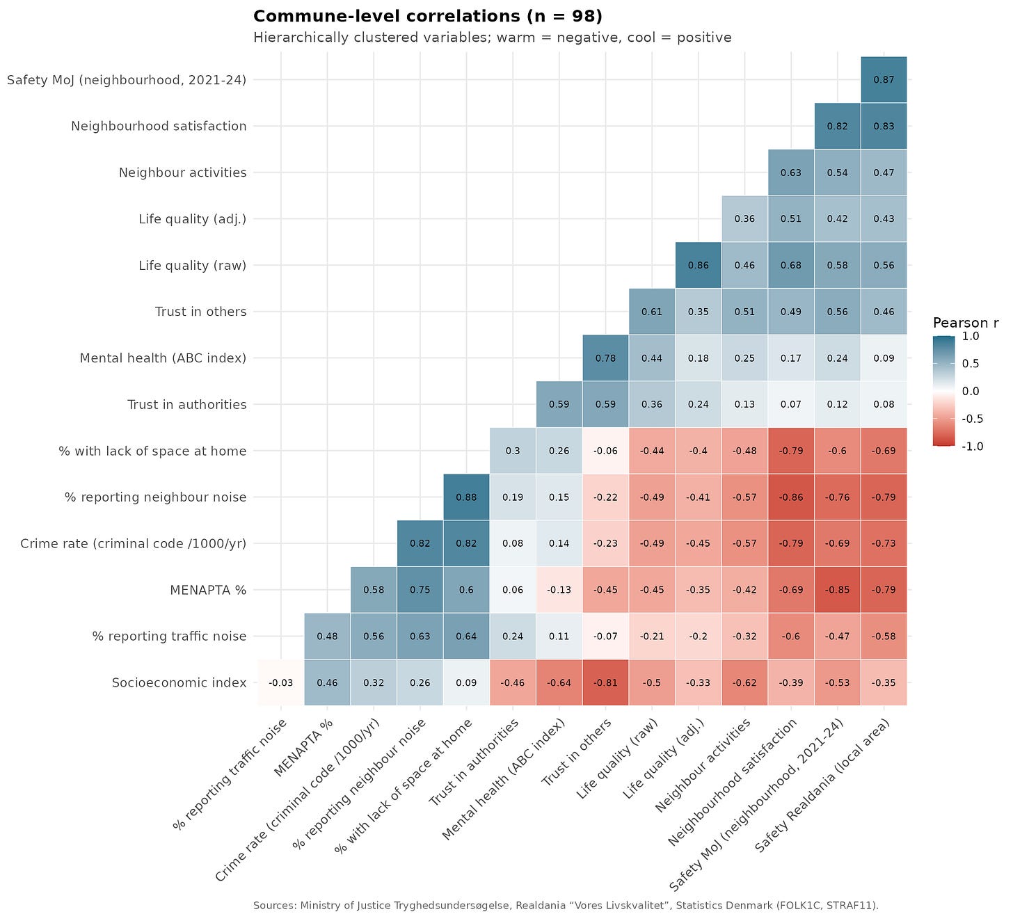 So MENAPTA% is the strongest correlate of feelings of safety, aside from the other measures given in the same survey. Some of the stranger correlations are probably due to aggregation issues. Aside from the Copenhagen splits, the other large cities are in a single commune unit that is thus composed of migrants, university students, rich Danes, working class Danes and so on, which may create strange patterns.