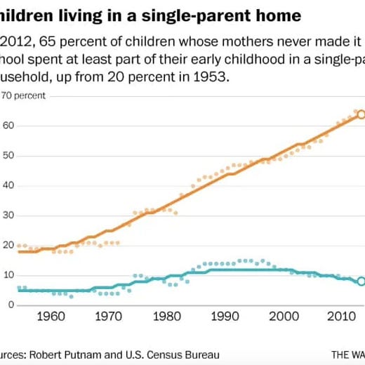 Thus, to go back to their plot, we cannot just consider women with high school or less as the same talented group over time. This group has become markedly lower in human capital traits, including intelligence but also other factors like impulsivity, over time due to the increase in formal education. Ideally now, we would re-do the original plot to see if this matters in this case, but that exercise is left to the reader. I would guess their pattern is still there, just less drastic. If we looked at the e.g. 25th, 50th, and 75th centiles of intelligence over time, what would be the single-parenthood among these? They would all increase, but most increase would be in the bottom 25th I would guess.