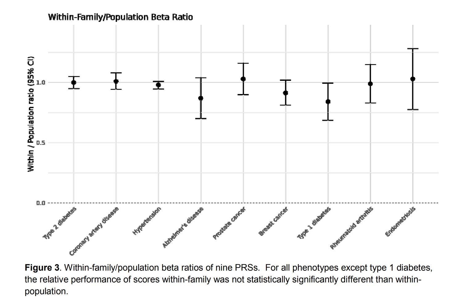 We adapted methods for within-family PRS validation from Selzam et al. for binary phenotypes (21), and calculated the ratio of within-family to population performance. We found that the within-family predictive power of the PRSs was not significantly different from the population predictive power for eight out of nine scores, with the exception of type 1 diabetes. The Liability R2 of type 1 diabetes was reduced accordingly for risk reduction calculations in the context of embryonic selection.