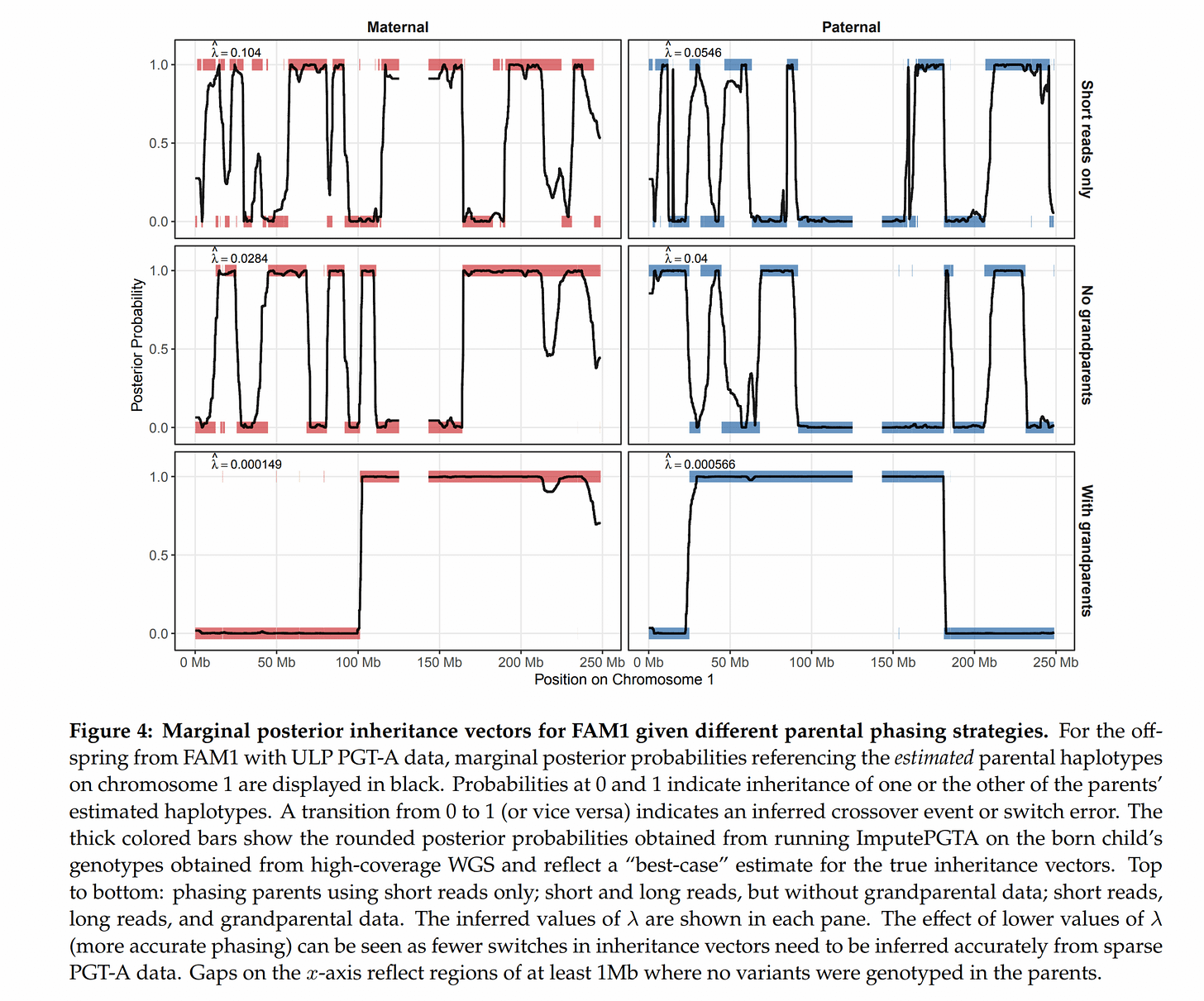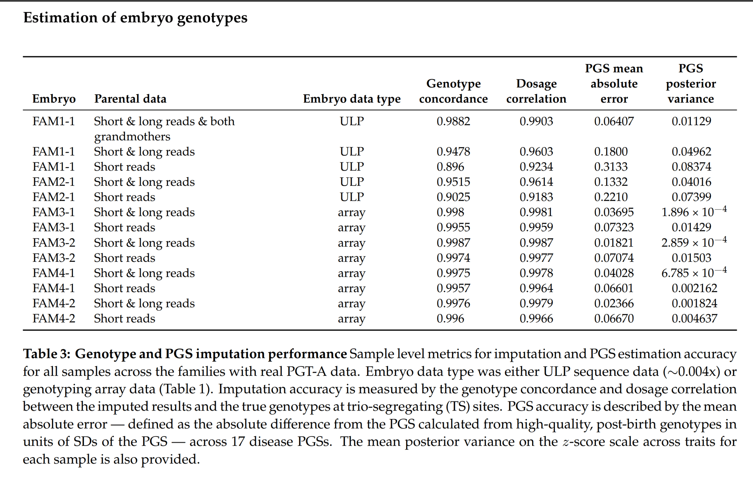 The problem with the data from these methods is that one cannot use them for scoring polygenic scores for phenotypes that are spread out in the genome. Since most phenotypes have such a distributed genetic architecture, data from PGT-A and PGT-M methods never concerns most of the relevant variants, and in the rare case that a variant is read once, there is no certainty about it due to inherent errors in the sequencing methods. So what to do? Well, one can impute genetic data using reference panels. We are quite familiar with this method from ancient genomes, and generally just upgraded array data (which typically measures 600k-2M snp-like variants with precision). The problem is that imputation using reference panels typically doesn’t work well when the sequencing depth (reads per variant) is much lower than 1x. However, this changes a lot if one has family data. Biologically speaking, the DNA present in a given embryo can only come from 2 places: mom and dad. Thus, if one knows the parental genomes with high precision (like 30x sequencing), all one needs to do is figure out which chunk at a given location came from which parental chromosome: