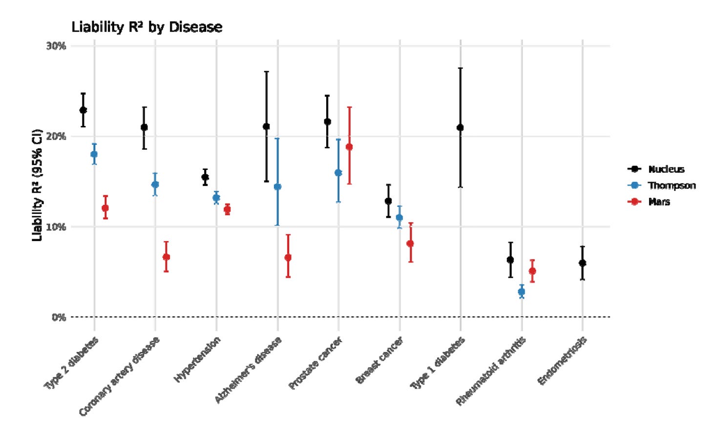 Sounds like normal startup company behavior. Presumably, Nucleus will pay for any settlements. Anyway, let’s move on to their validation paper. It concerns the 9 diseases they built prediction models for. They were able to pool some great datasets: “Million Veterans Program (MVP), Finngen, the UK Biobank (UKBB), All of Us (AoU), and various trait-specific consortia”. They are missing some cohorts, e.g. the Japanese Biobank. Their comparison figure is: