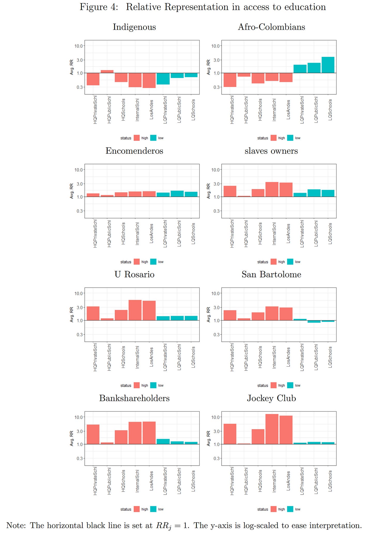 LQ = low quality, HQ = high quality, Los Andes = national top university, international schools = high ranking schools. With this in mind, we can interpret the figures. In the top left, we see that native American (indigenous) surnames are ~0.3 as like to attend the top university, but also mysteriously less likely to attend the low quality schools. My guess is that their children often don’t go to school at all. Otherwise, how do the results make sense? The authors don’t discuss this obvious issue with the results. The African descent population is also less likely to attend the top university, but over-represented in low quality schools. My interpretation is that they live in cities and send their kids to school, but they end up in the worse schools because they perform poorly academically. The various other elites also have kids that are over-represented in high quality schools and to a lesser extent the low quality schools (again, I assume because many children just don’t go to school at all).
