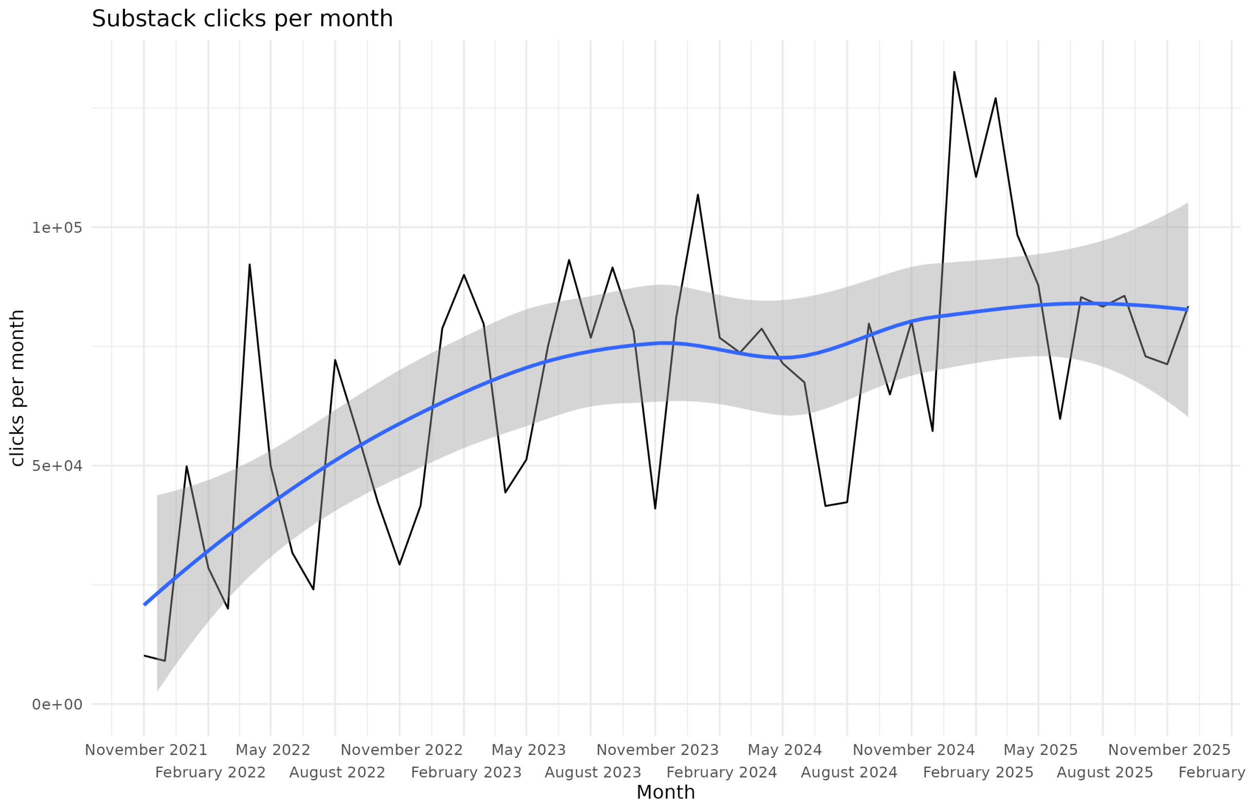 The moving average is about 85k clicks per month, with recent spikes in early 2025 and a low in the summer due to traveling. As for the exact metric, Substack just says “How many times your Substack was viewed over the selected period, including emails.”, which I think is total clicks including those detected by opening emails with embedded Javascript. The total reads for 2025 was 1,098,063. In comparison, both 2024 and 2023 were about 850k, and the total Substack reads is 3,378,298. That’s a lot of reads!