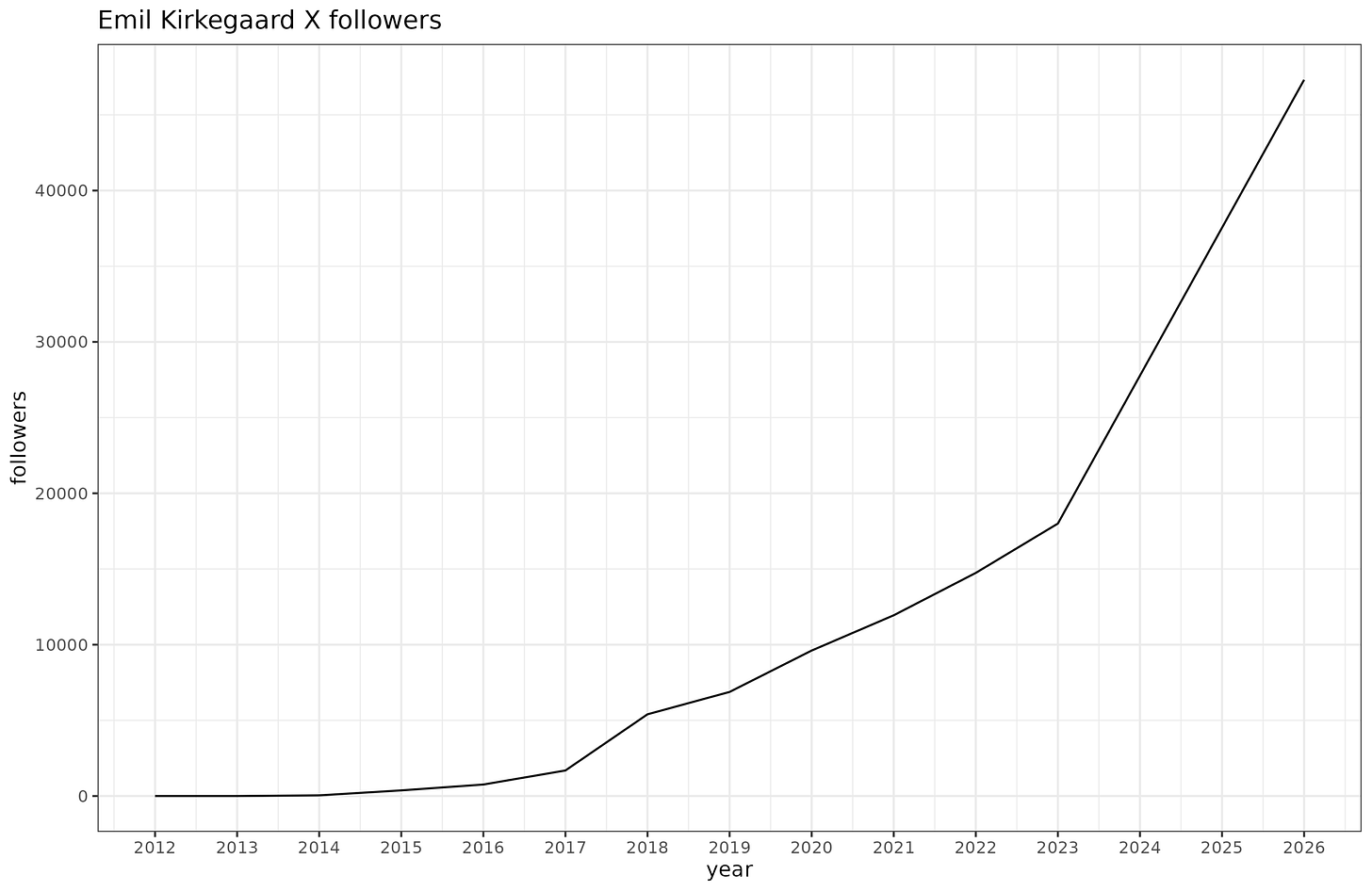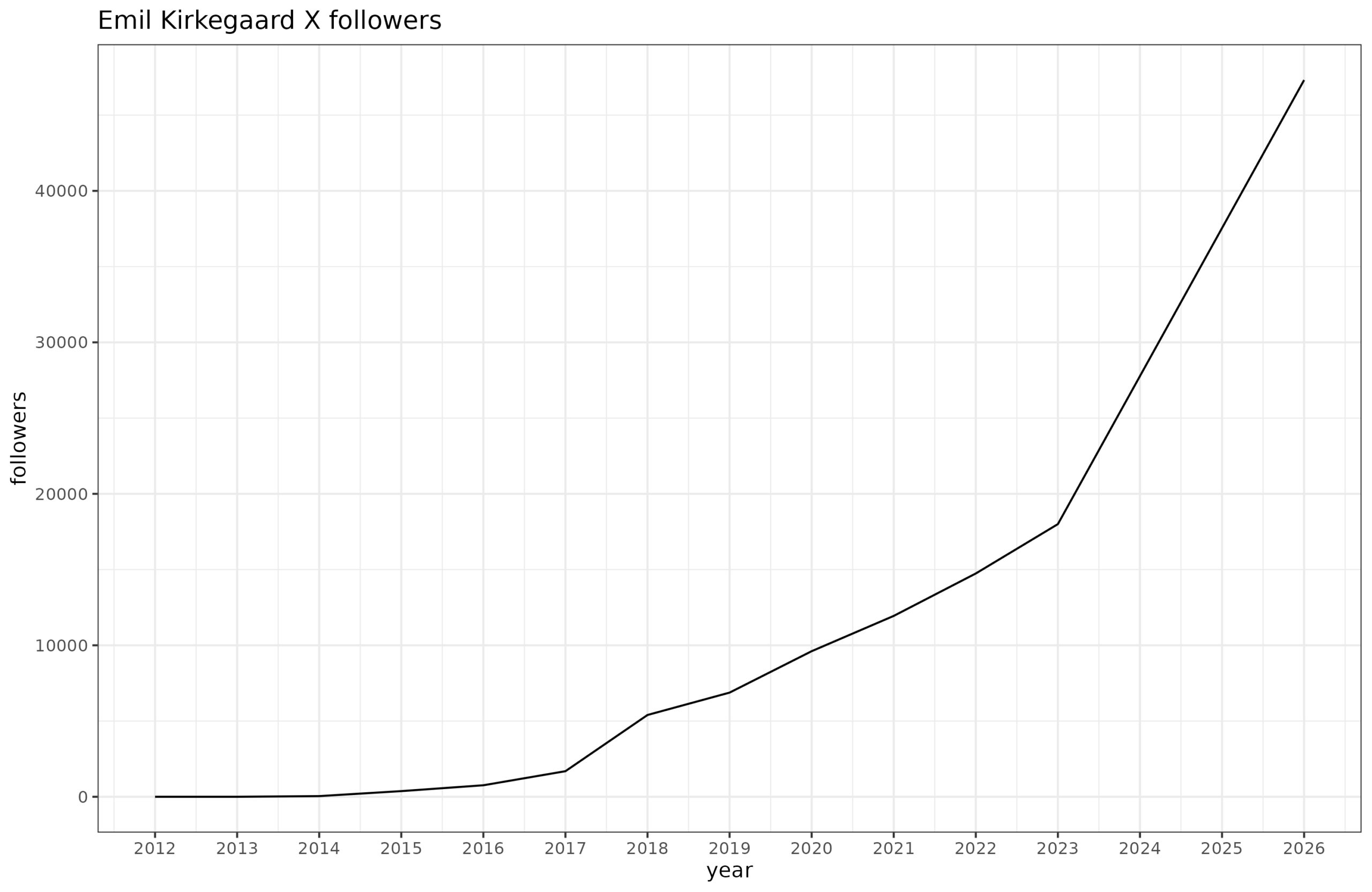 This one is rather obnoxious since X doesn’t have any historical data. There are a variety of websites for tracking this, which all suck. So I’ve resorted to manually getting the follower counts by using the Internet Archive to look back in time. This gives somewhat sporadic coverage (since writing a scraper for IA is very annoying and slow, so I only handpicked the earliest data for each year), but overall we get this result: