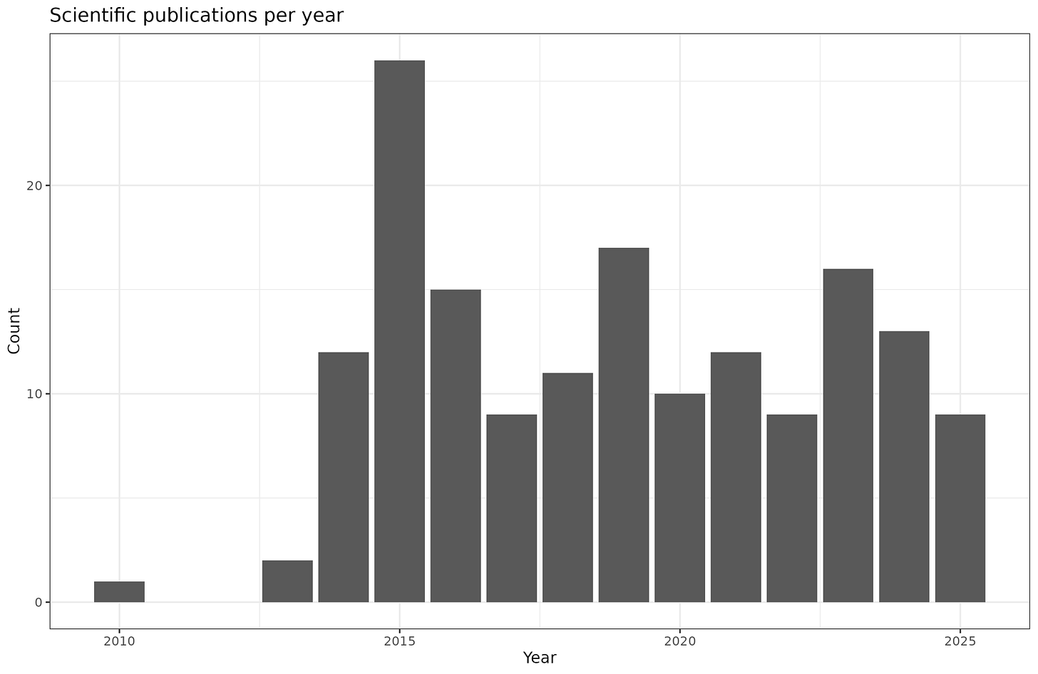 My front page has a list of publications, as does ResearchGate. The counts per year are:
