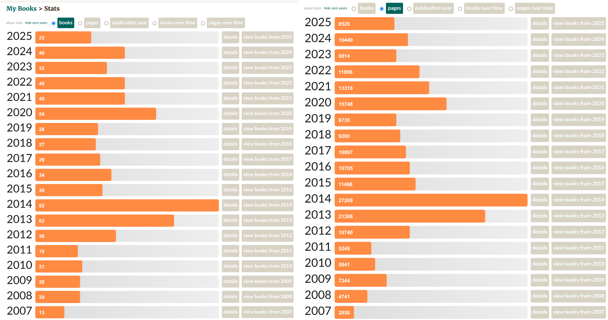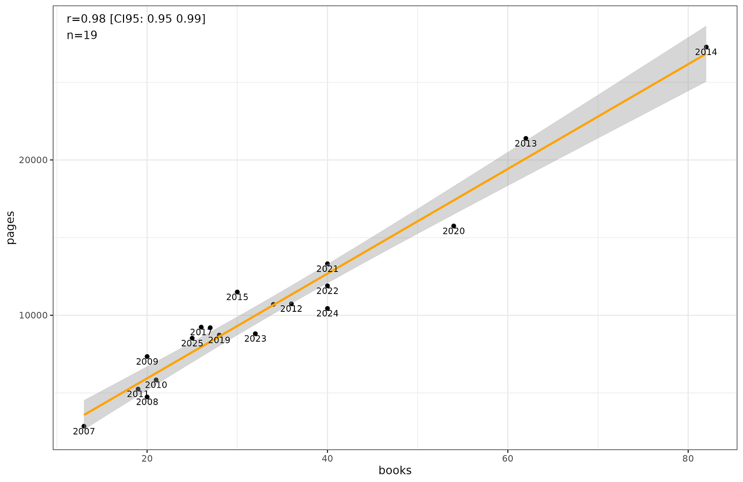 But the correlation is 0.98, so whatever strategy was used to try to achieve yearly goals, it was too small to cause much disturbance to the general pattern that reading more books is reading more pages.