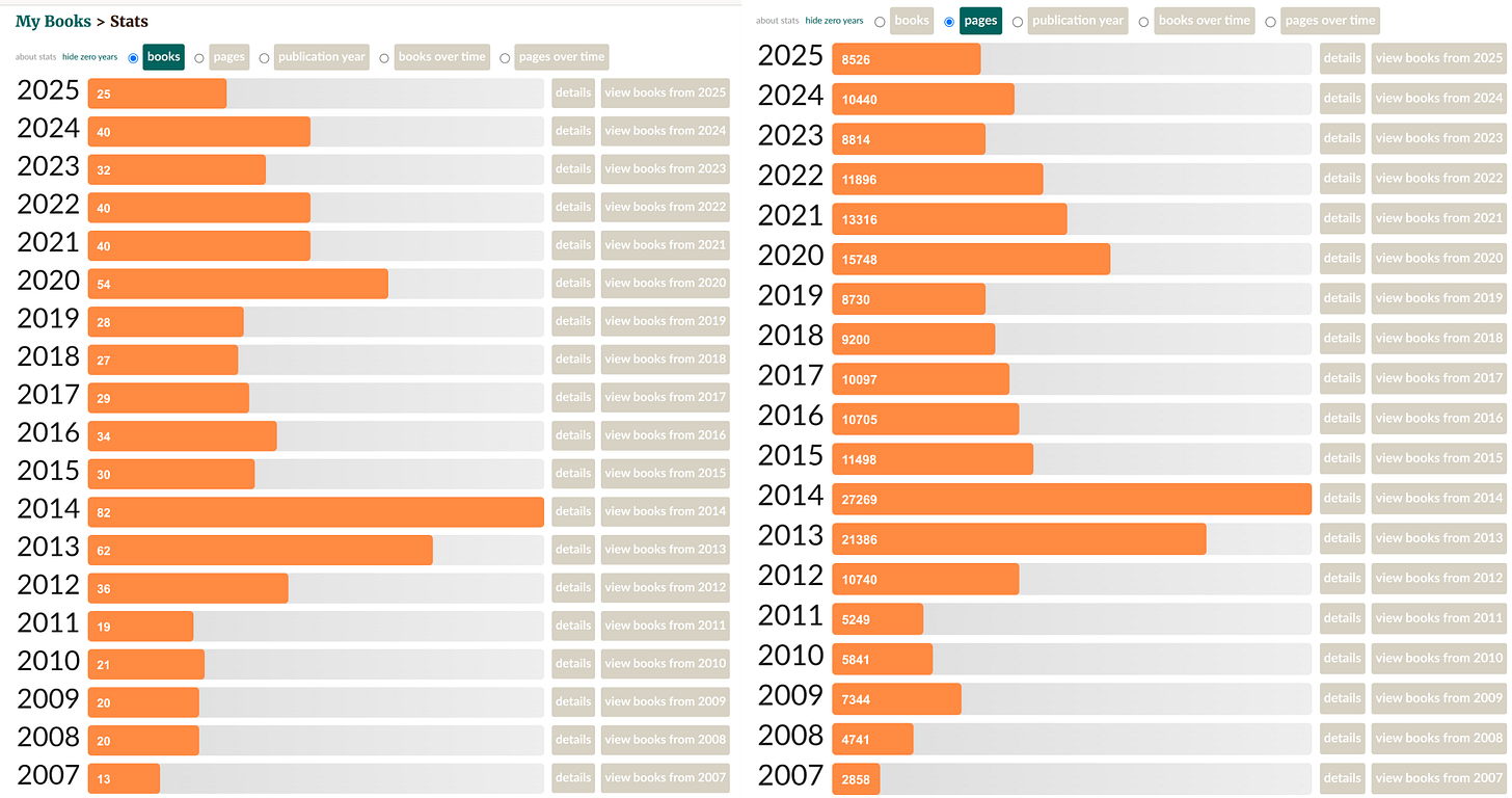 Ah yes, it’s time to get back to work after the holidays. So let’s start with the yearly recaps. First off is my own productivity numbers (which is what you support by subscribing on Substack/X), and next up I will do the mini book reviews of the books I read in 2025. Prior years reviews: 2024, 2023 (forgot?), 2022, 2021, 2020.