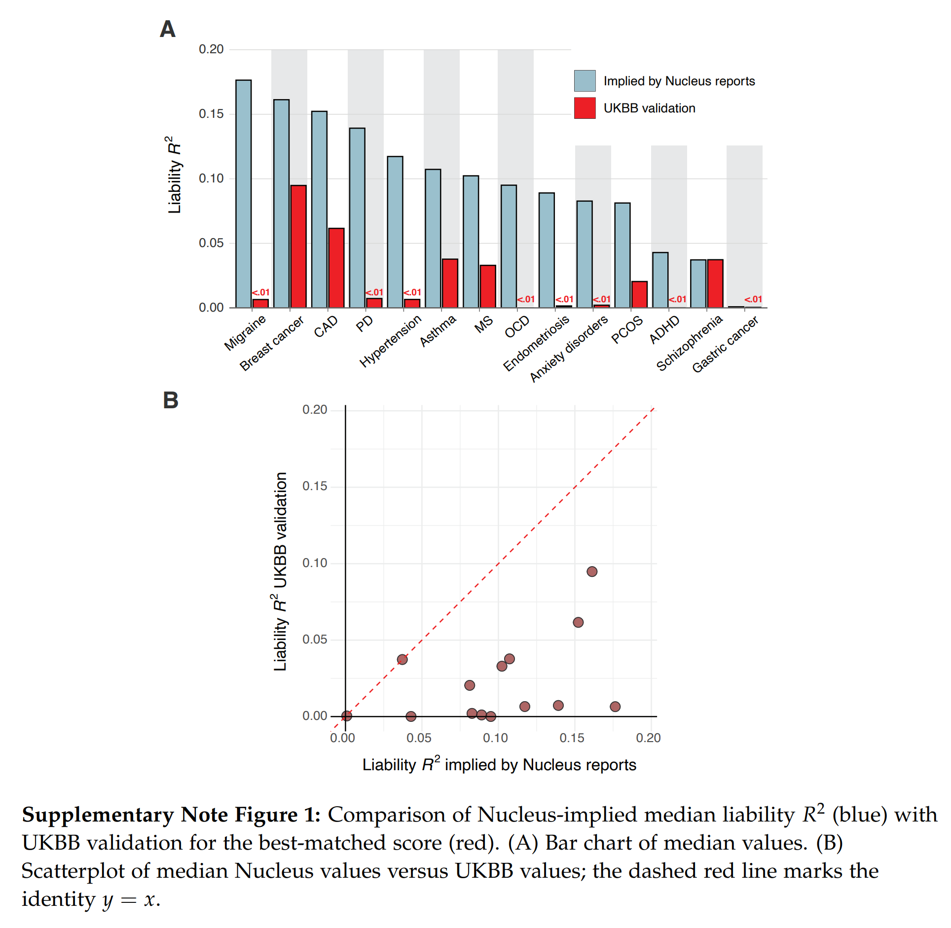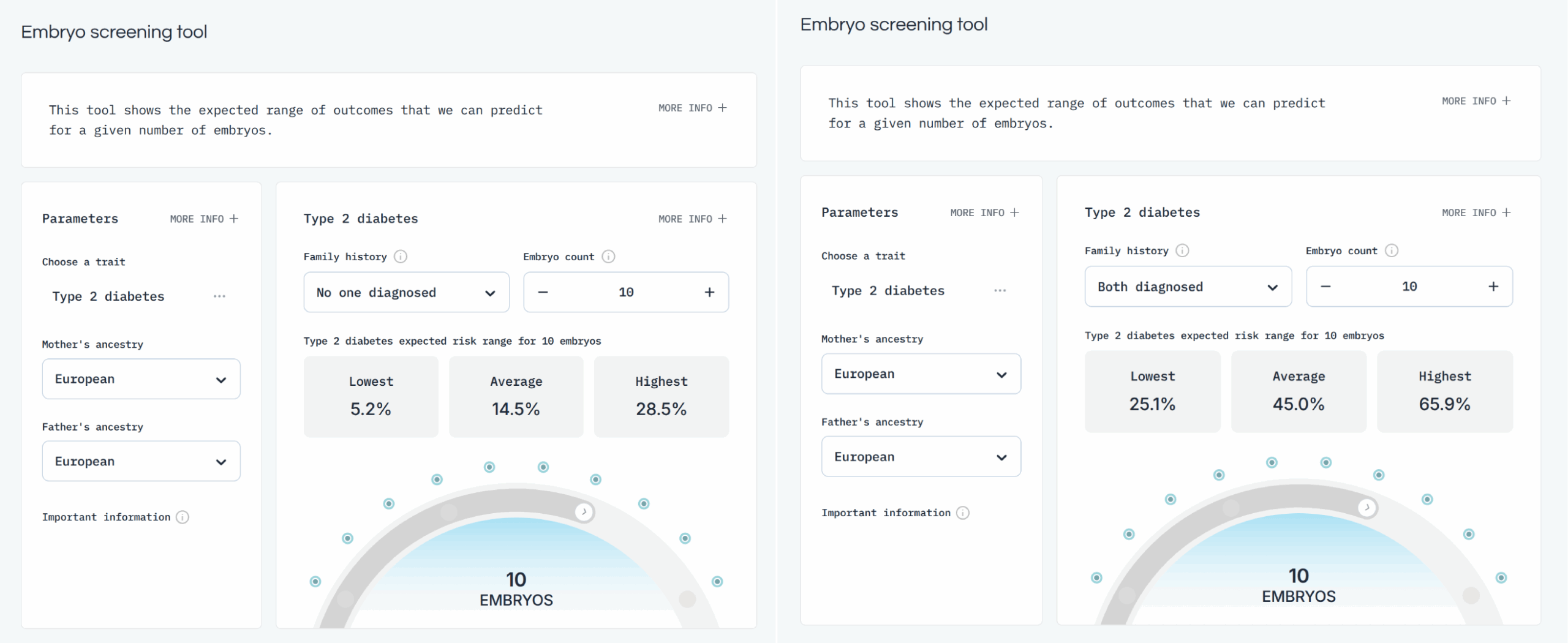 Nucleus gives their customers predictions for embryos like those in the simulator above, but they seem ... too good. Herasight took advantage of the fact that these reported probabilities are convertible to liability R2s if one makes assumptions about the prevalences (e.g. diabetes is 15%). Doing this math shows that the models have implausibly high validities, far beyond any competitors or academic results. Using the source code of the forgone impute.me website (which is archived on certain Github mirrors), it is possible to check whether their current models are the same as those from years ago. Some of these models are downright shoddy, based on only ~12 SNPs! They find that this is mostly the case, meaning that Nucleus has done very little additional R&D before public. And they did this with bad models, but then incorrectly specified them, making them seem much more accurate than they are. In the end, this misleads customers into making wrong decisions (you think you are reducing breast cancer by 20%points, but in reality, it may be 5%points and you should have picked a different embryo). Hopefully, few people have used their service as it is at this time. They have a huge budget (raised >30 million USD!). There are further impossibilities, such as a customer report showing an embryo an elevated polygenic score for ADHD, but somehow has a below average estimated risk. This is just mathematically impossible. Due to these issues, it would make no sense comparing the implicitly claimed validities by Nucleus with the more reliable estimates from Genomic Prediction, Orchid, and Herasight.