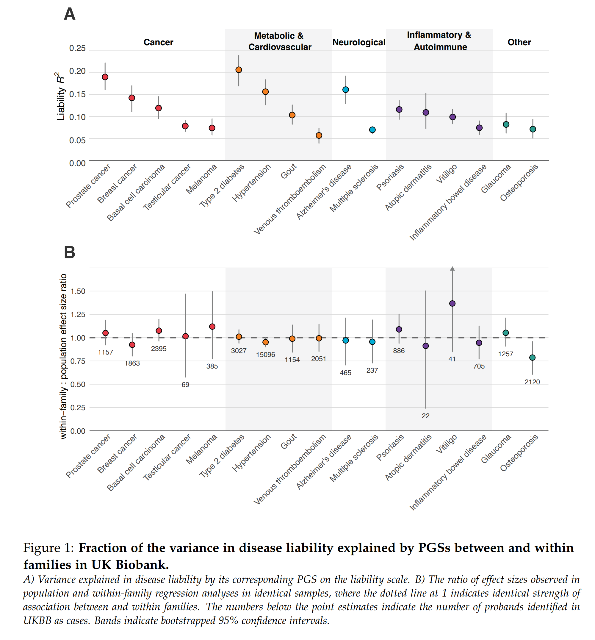 Given these varying factors, it is nice that they were still able to get to ~20% liability R2 for some of them and none of them really showed any within-family decline (one shows a slight decline, but the confidence interval is very close and there seems to be no multiple testing correction applied). What does this mean in practice? Well, this is where we can use their simulator to get an idea of what a typical couple can expect: