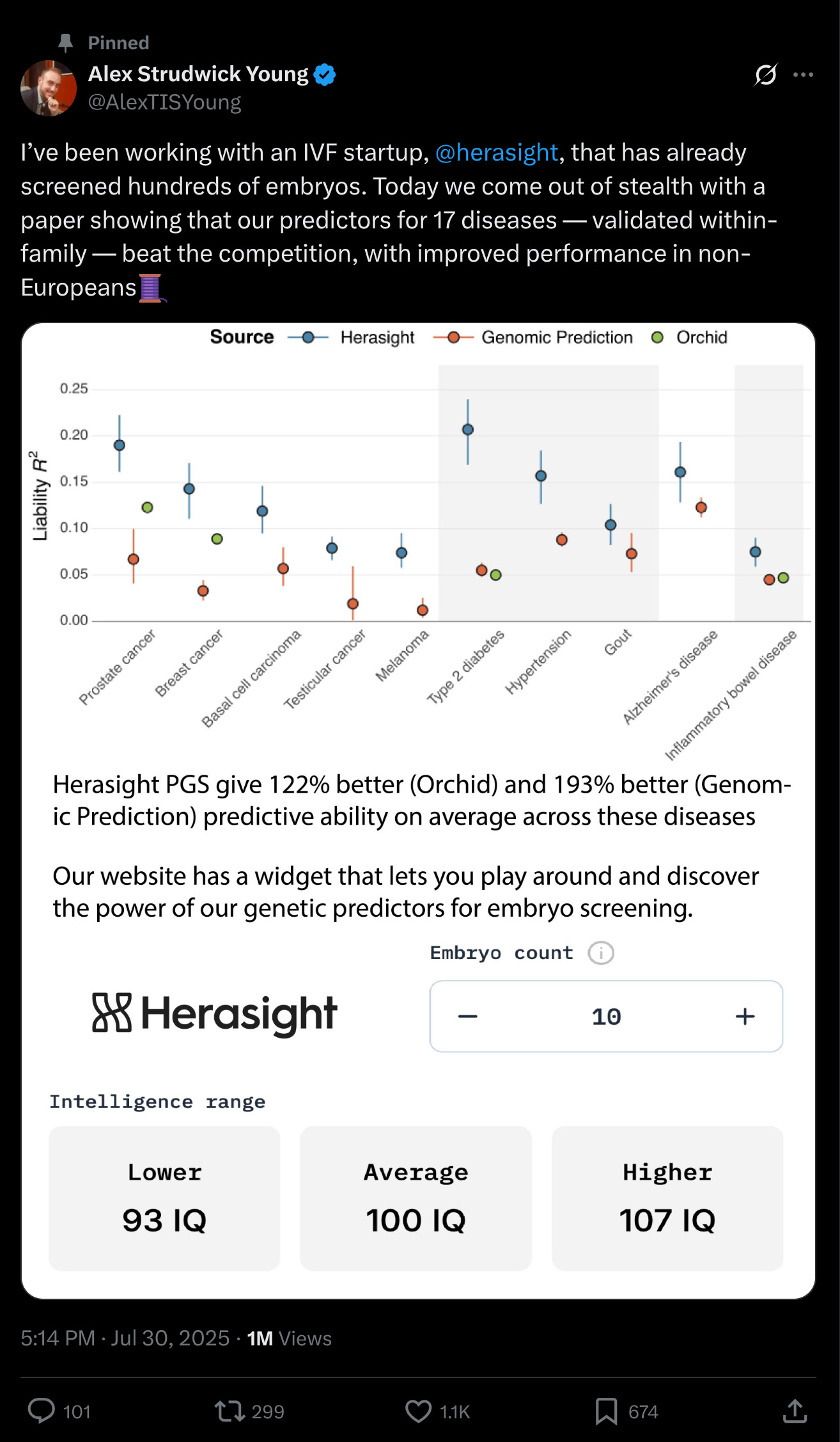 Today is an exciting day. First, the HHS announced a more open data policy (in the direction of my suggestions), and second and more importantly, a new company just went public with their embryo selection service. Herasight is the name, which presumably relates to Hera, the Greek goddess of family and women, which shares the root with heritability. The name thus means ability to see genes, very fitting. Most importantly, they published their validation white paper the same day as well as a blogpost summary, and a small embryo selection simulator on their website. If you just want the summary, read Alex Young's X thread: