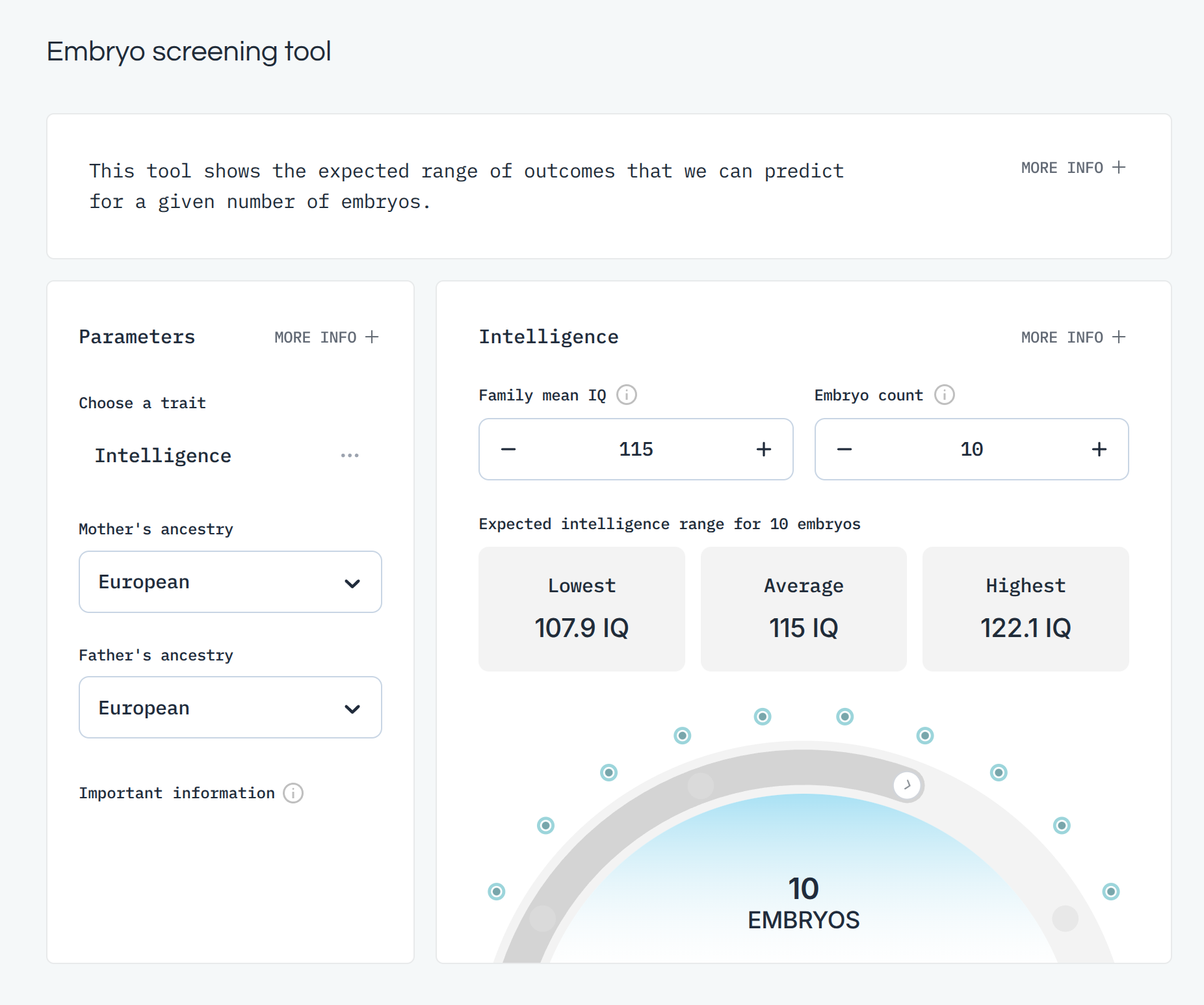 In this case, you must input an estimate of the parental (additive) genetic mean IQ. Basically, this is the question of whether you come from 'good stock' intelligence wise. A typical reader of this blog appears to have an IQ around 130 which would statistically mean (assortative mating of ~0.5) the other spouse is around 115 IQ, for a mean phenotypic IQ of 123. Given some regression towards the mean, the parental mean genotypic IQ is about 115 (that is, assuming additive heritability of 70% from 123 IQ). Picking the smartest embryo will (on average!) result in 122 IQ, or a gain of 7 IQ relative to expectations (not using embryo selection), which is still a decline of 1 IQ compared to the parents. The reason for this is that non-perfect heritability fundamentally limits how fast selection can affect a given trait. It does not mean selection is impossible because in the next generation the genotypic mean IQ will have changed upwards (many people mistakenly think regression towards the mean happens each generation and thus selection is impossible because they fail to account for the increase in the genotypic mean trait value).