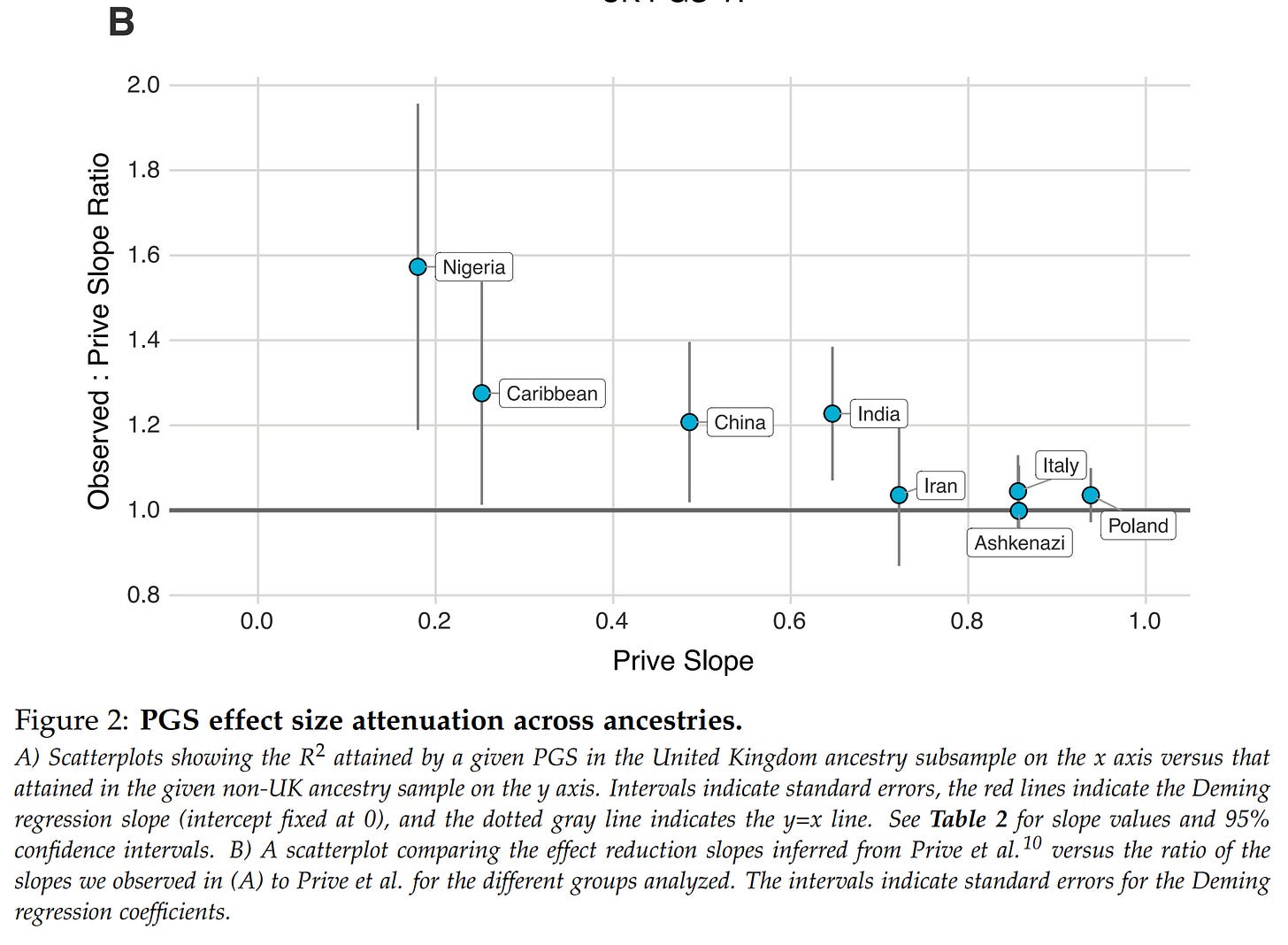 Genetic models would ideally find causal variants in the genome (which we could edit directly for much larger improvements), but in general, they cannot, so they find non-causal (tag) variants that are highly correlated with the causal variant(s). These correlations among variants (called LD) differ by population in value (e.g., may be 0.9 in British but 0.8 in Polish), and overall strength. The more inbred a group is (smaller effective population size), the stronger the correlations. Due to these factors, the genetic models using, in part at least, tag variants which will not function as well in other populations because they are specifically chosen for having strong correlations in that population with the causal variant(s). This results in a predictable decline in model validity as a function of genetic distance (this is already known from animal breeding). They validated this expectation on their data, with the expected results that non-British Europeans show minimal less of validity, while Africans show the highest. This makes sense since Africans are both the furthest apart genetically from the British and they have weaker LD (because they are the founding population of humanity, and the others have gone through bottlenecks). This reduction is important because it means the effectiveness of the predictions must be taken into account in the results shown to customers.