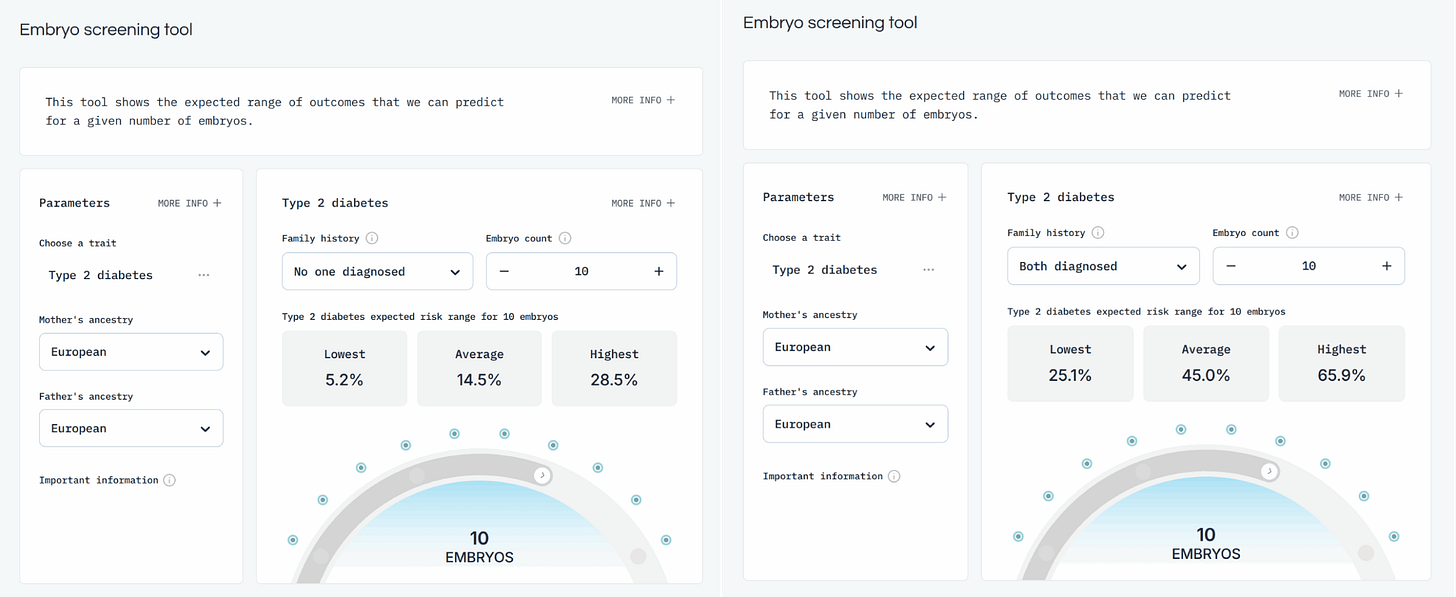 Type 2 diabetes is relatively common, as it is both a disease of old age and of prosperity obesity, both of which are unfortunately common in the Western world. A typical couple may have about 10 euploid (correct number of chromosomes) embryos to choose from. Given this scenario, on average, the worst embryo (for this phenotype) will have a risk of ~29% and the best a risk of only ~5%, roughly a 6x difference. If, on the other hand, your parents are both diabetic, the family-related risk is starkly increased from ~15% to 45%. The worst embryo will on average have a risk of ~66% and the best ~25%, only a ratio of ~2.6. The relative ratio is, however, not what many would be parents (should) care about, but the absolute risk reduction. Using the service, they could roughly reduce the risk of diabetes by ~40%points, which is a massive difference. It doesn't quite make the family-related risk go away (~25 vs. ~15%), but it is approaching that. This is what a polygenic score of ~20% liability R2 can give you. Not perfect, but good, and probably worth it in many cases. Of course, given current trends regarding effective obesity and thus diabetes treatment (Ozempic like GLP-1 drugs), this phenotype may take less priority.
