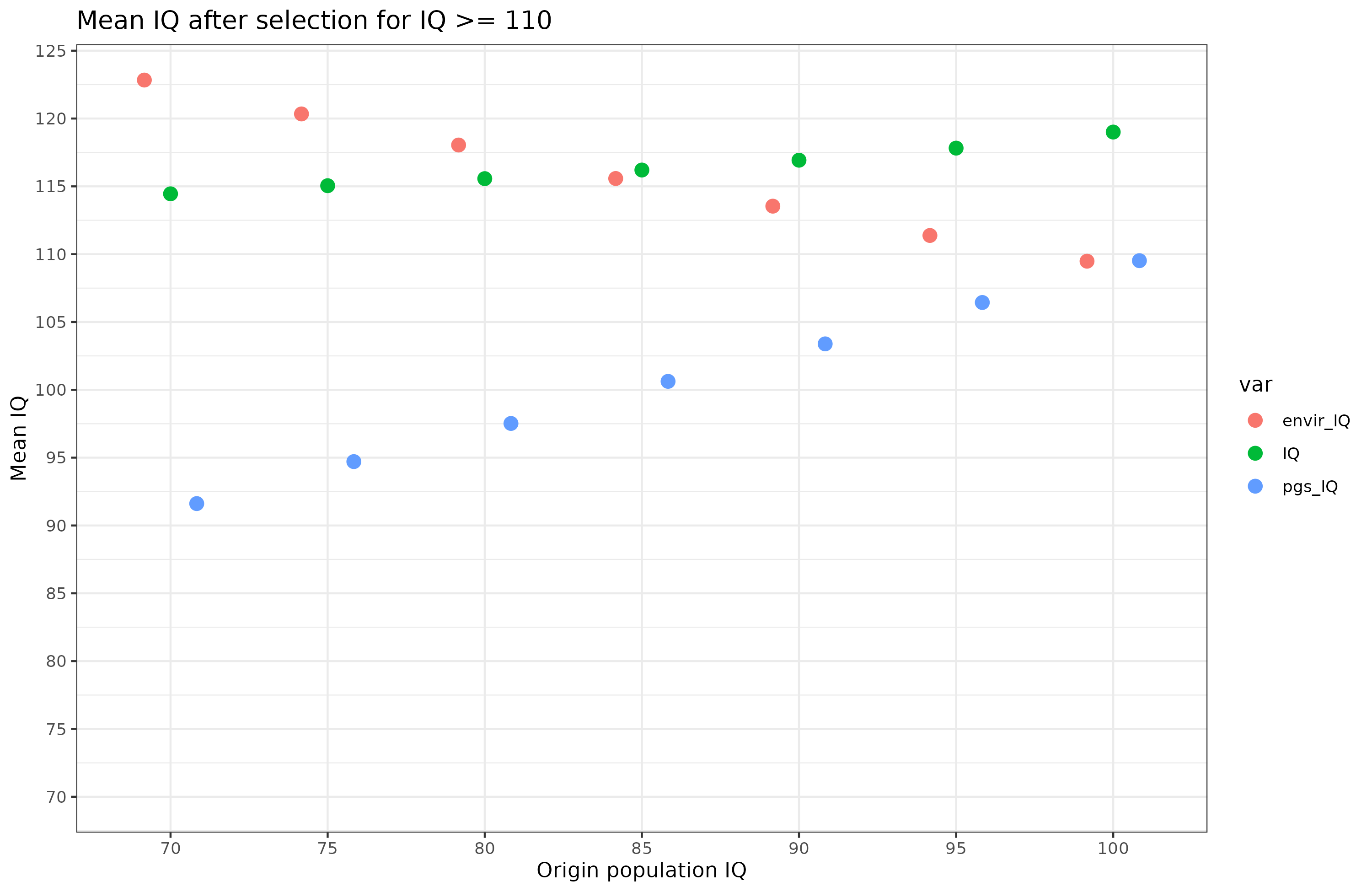 So, in this simulation, if we start with a population of people with phenotypic (real-life) and genetic IQs of 70, and we select those above 110 IQ, this group will have an average IQ of about 114 (green dot on the left). If instead the origin population started at 85 IQ, the selected group would have an average of about 116 IQ (green dot in the middle). Identical selection thresholds lead to some residual group differences. This effect can be smaller or larger depending on the distance of the threshold to the group means. Affirmative action aside, this is why e.g. Jewish doctors are smarter than White doctors who are smarter than Black doctors, even if they all graduated from the same medical school.