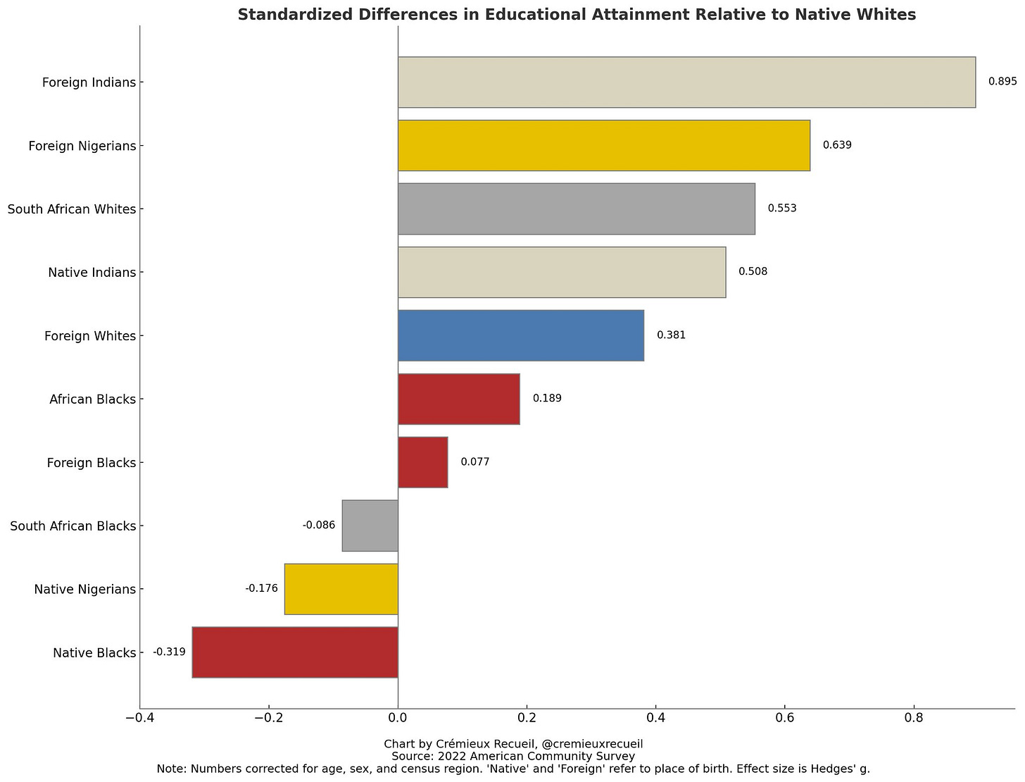 Two groups commonly discussed are the Nigerians and the Indians. Foreign-born Indians are about 0.9 standard deviation above average in education, and their children are about 0.5 d above. Foreign-born Nigerians are about 0.6 d above, but their children are about 0.2 below. The groups regressed about 0.4 d and 0.8 d. This difference should reflect, among other things, the difference in average genetic intelligence in these populations. Typically, Africans are estimated at about 80 IQ and Indians may be 85 or 90, we don't have that solid data.