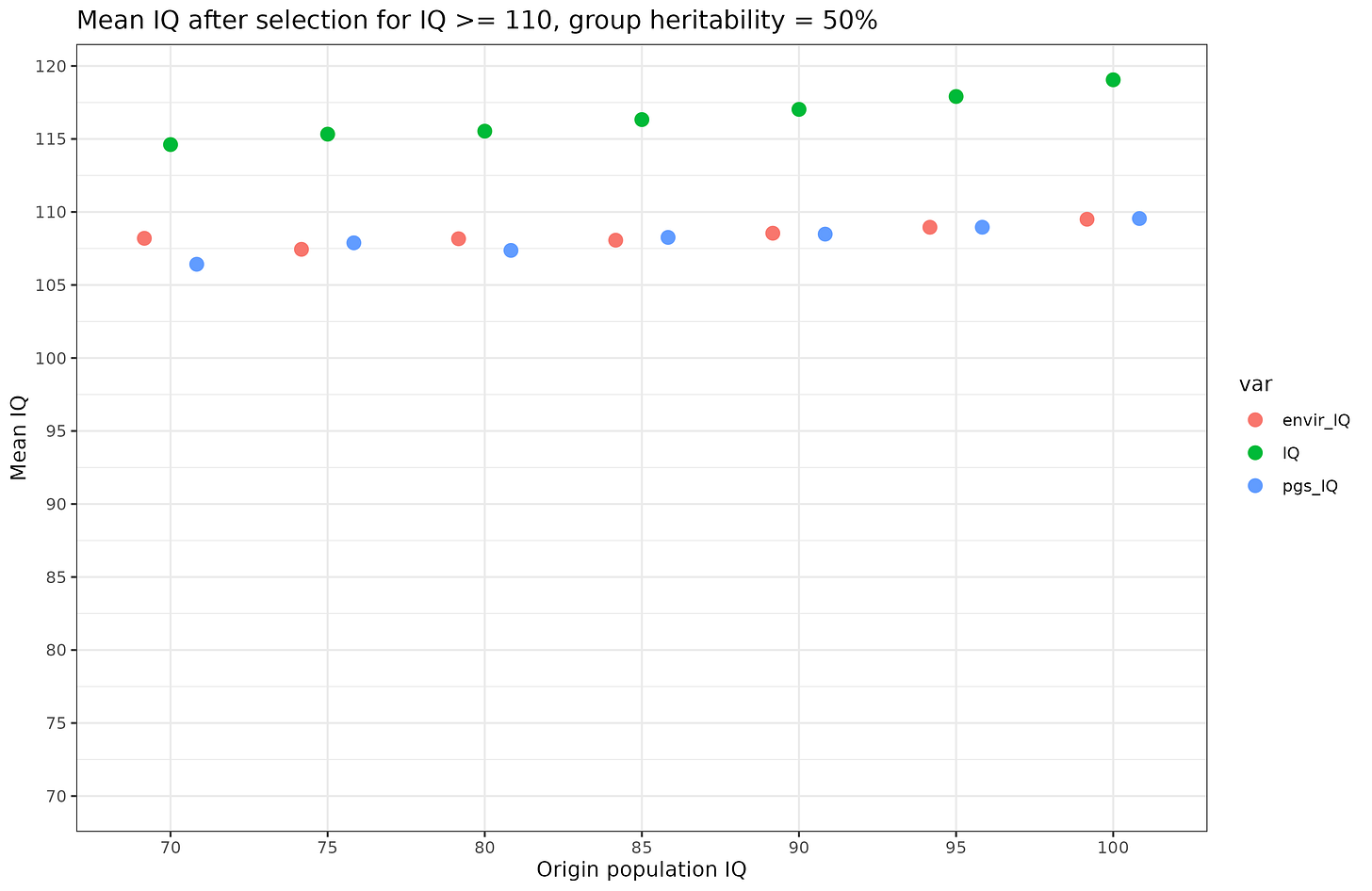 We can now see that increasing the selection threshold results in higher average genetic IQs for all groups in a relatively straightforward fashion. Even for the IQ 70 origin population, picking people with 100+ IQs results in an average genetic IQ that is about 102. Their children will not be below average. Regression towards the mean is not so extreme when we drop the assumption that between population heritability is 100% and substitute a more reasonable 50%.