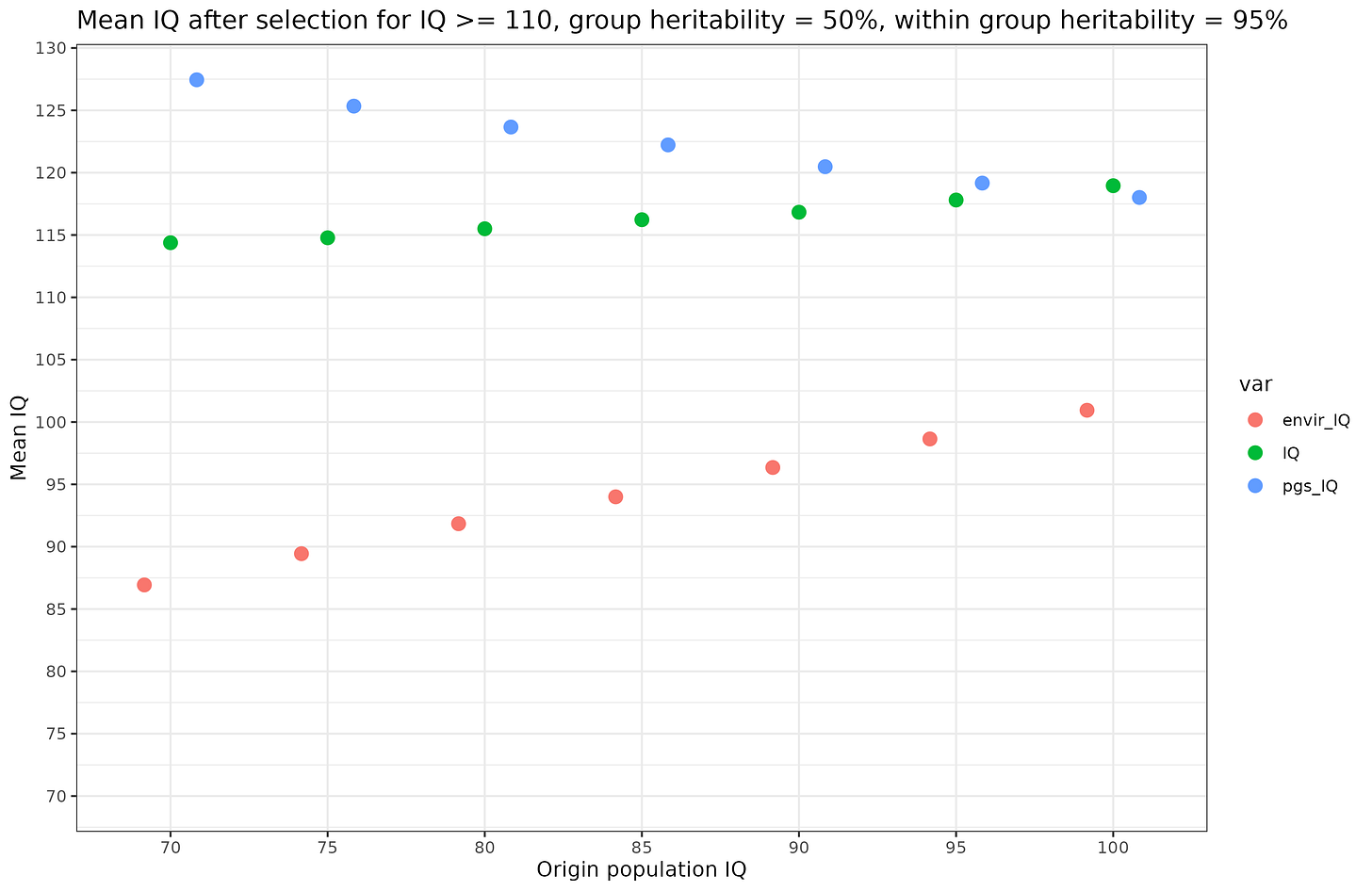 Here the within group heritability has been increased from 50% to 95% and the other factors stay the same. But look at the effect on the selection on genetic IQ (again, in blue). The lower the origin IQ, the higher not lower, the expected genetic IQ. How is that possible? It's because when the effect of environment is so small within the population (5%), in order to achieve high IQs (110+), one must almost always have a very strong genetic IQ. And since in this case, there's almost no genetic regression towards the mean, this genetic advantage will be mostly kept in the next generation, while the environmental advantage will disappear for migrants.