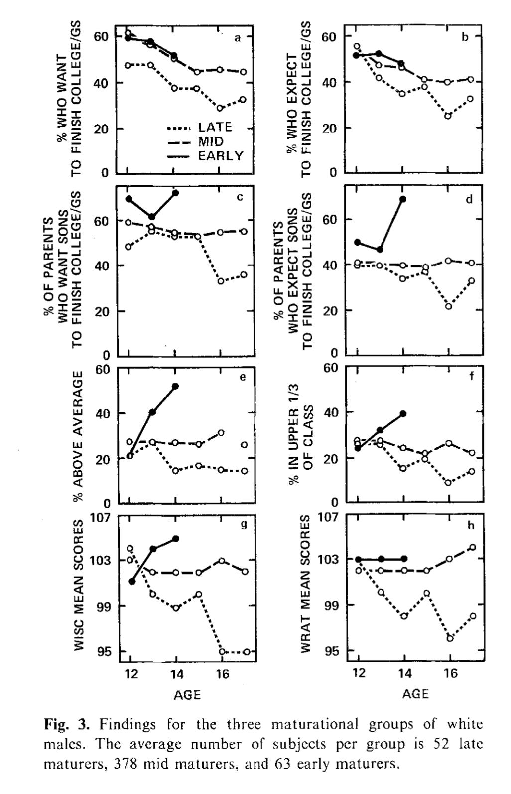 The stippled line are the late maturers (slow developers), their scores, both objective (WISC and WRAT) and subjective were below average, while the early maturers were above average. Clearly, the expectation from Rushton's model failed here.