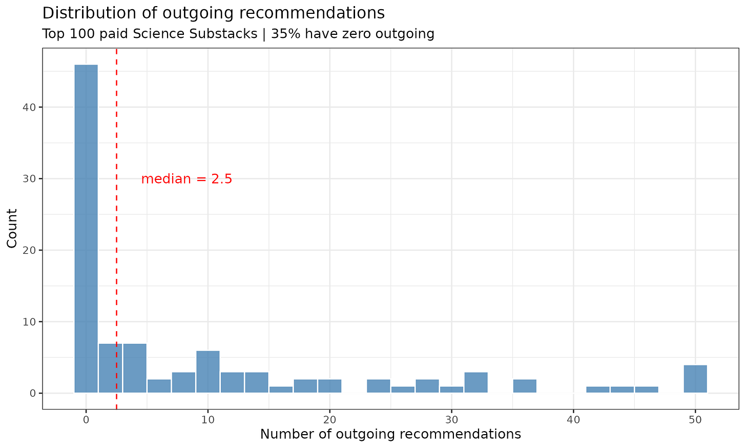 Today I wanted to tackle a different question. Substacks relate to each other in various ways. They can link to each other in posts, say, because they are having a debate, or because they just feature link collection posts. One could collect of all these by scraping the HTML code and finding all the cross-links. Another option is using Substack’s recommendation list. A given Substack can recommend other Substacks. I scraped this data initially for all the top 100 science Substacks, but it turns out that many people don’t use the feature: