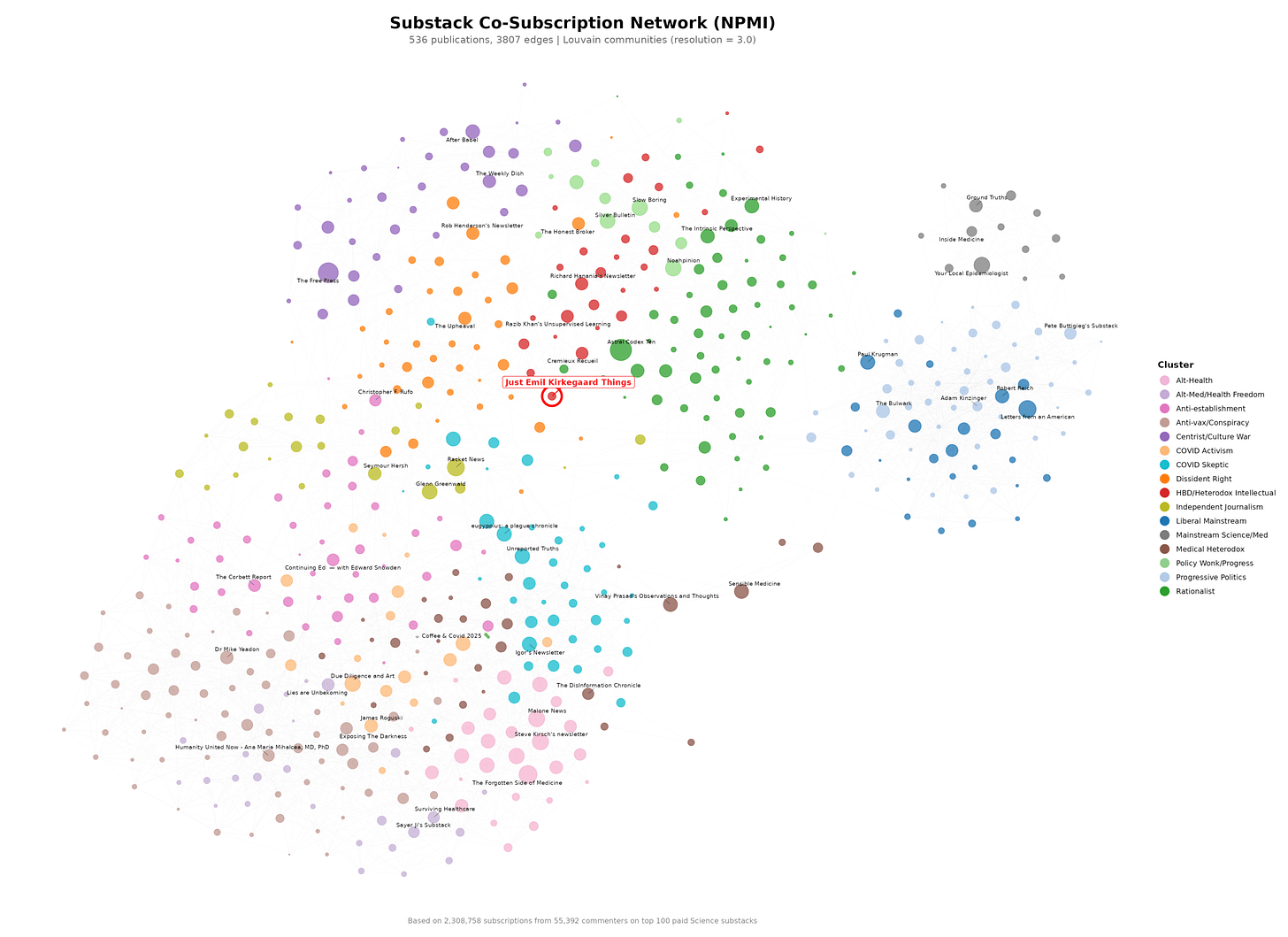 It’s a beautiful power law distribution. Using these subscriptions, we can build an overall network of Substacks using NPMI: