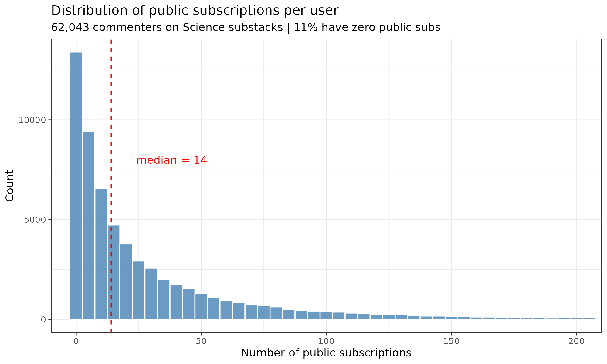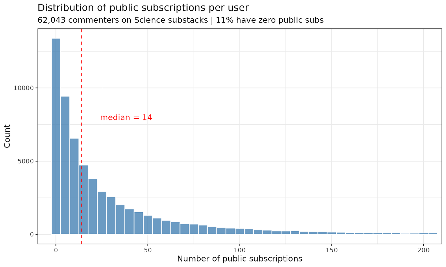 I think this is some variant of the crude overlap from my Substack’s perspective, which is to say that 33% of subscribers also subscribe to Aporia, 26% to Cremieux and so on. The problem with this metric is that larger Substacks will always have more overlap in general, regardless of whether they have any particular shared topics or not. One solution to this is to use the PMI metric. This is based on the relative rate of overlap given a neutral prior. So if one Substack has 10% of all users and another has 5%, their expected overlap by chance is just the product, that is, 0.5%. If we find that the actual value is 2%, then the relative rate is 4x, and PMI is log2(RR). The related NPMI metric normalizes this value to -1 to 1 range. Anyway, the Substack-level recommendations are unsuitable given the 35% of the data is missing. But we can go further. I scraped all the posts for the top 100 science Substacks to find all the users (~31k posts). Then I scraped all the users’ pages to see which Substacks they subscribed to (~62k users). Their distributions of subscriptions look like this: