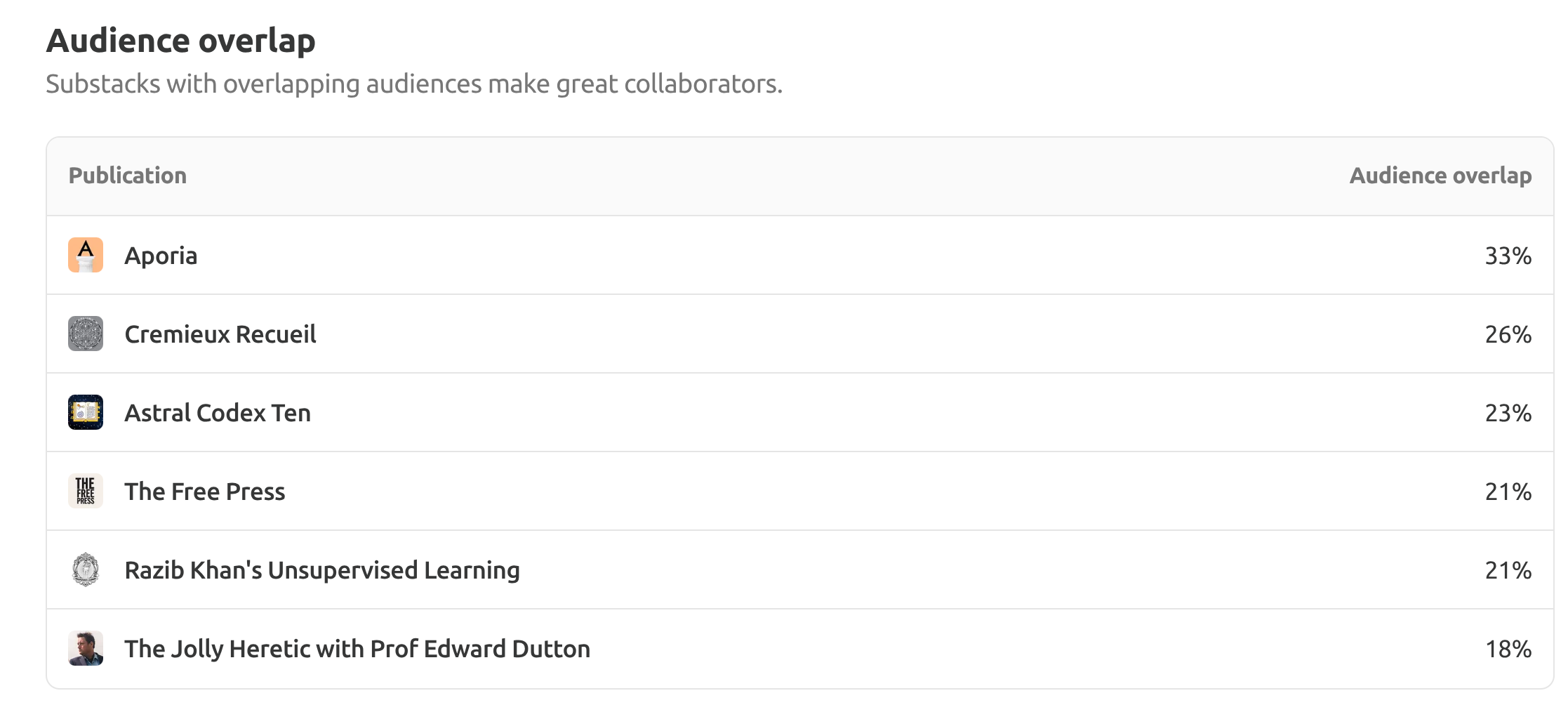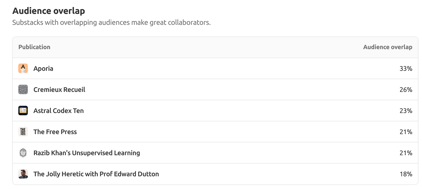 So 35% of these popular Substacks don’t recommend anyone, which is poor manners, but also gives the authors an easy way out in case someone asks them “Can you please add me to your recommendation list?”. Additionally, it protects the authors against 6 degrees of Kevin Bacon guilt by association recommendation. Whatever the reason, this dataset is not great for analysis. Regarding the network data, Substack itself provides the crude overlap metric. Mine are: