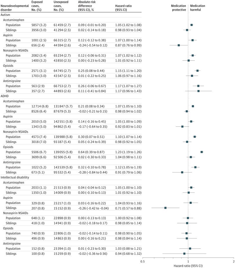 Results In total, 185 909 children (7.49%) were exposed to acetaminophen during pregnancy. Crude absolute risks at 10 years of age for those not exposed vs those exposed to acetaminophen were 1.33% vs 1.53% for autism, 2.46% vs 2.87% for ADHD, and 0.70% vs 0.82% for intellectual disability. In models without sibling control, ever-use vs no use of acetaminophen during pregnancy was associated with marginally increased risk of autism (hazard ratio [HR], 1.05 [95% CI, 1.02-1.08]; risk difference [RD] at 10 years of age, 0.09% [95% CI, −0.01% to 0.20%]), ADHD (HR, 1.07 [95% CI, 1.05-1.10]; RD, 0.21% [95% CI, 0.08%-0.34%]), and intellectual disability (HR, 1.05 [95% CI, 1.00-1.10]; RD, 0.04% [95% CI, −0.04% to 0.12%]). To address unobserved confounding, matched full sibling pairs were also analyzed. Sibling control analyses found no evidence that acetaminophen use during pregnancy was associated with autism (HR, 0.98 [95% CI, 0.93-1.04]; RD, 0.02% [95% CI, −0.14% to 0.18%]), ADHD (HR, 0.98 [95% CI, 0.94-1.02]; RD, −0.02% [95% CI, −0.21% to 0.15%]), or intellectual disability (HR, 1.01 [95% CI, 0.92-1.10]; RD, 0% [95% CI, −0.10% to 0.13%]). Similarly, there was no evidence of a dose-response pattern in sibling control analyses. For example, for autism, compared with no use of acetaminophen, persons with low (<25th percentile), medium (25th-75th percentile), and high (>75th percentile) mean daily acetaminophen use had HRs of 0.85, 0.96, and 0.88, respectively.