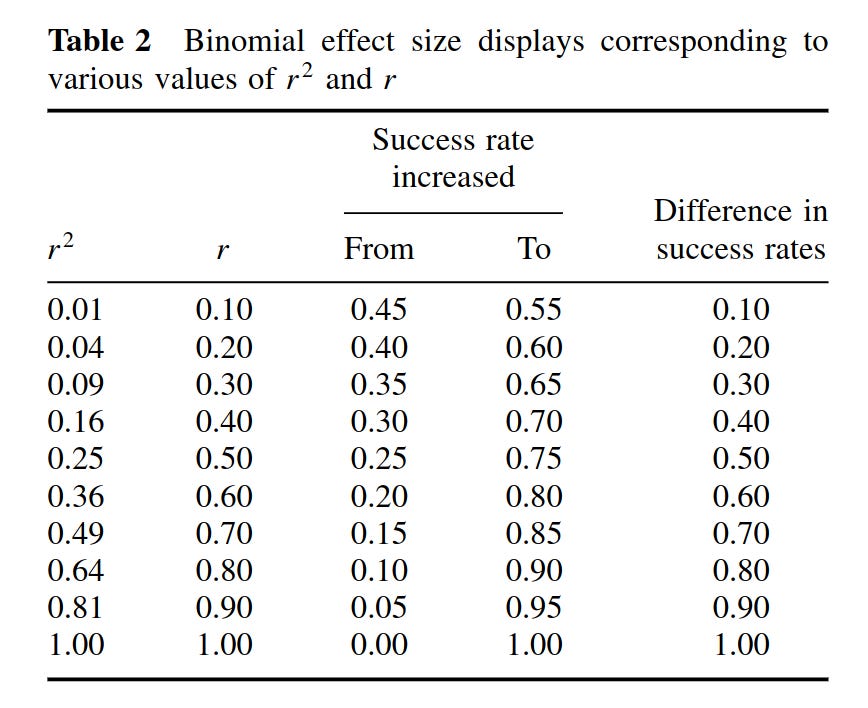 The BESD illustrates the size of an effect, reported in terms of r, using a 2 × 2 table of outcomes. In its usual application, the process begins with assuming that a sample of 200 individuals has been divided into two equal-sized groups, one of which has experienced an intervention (e.g., a drug for a disease all 200 have) and one of which has not. It is further assumed, for the sake of illustration, that for half the individuals the intervention was successful, and for the other half it was not. ... In Rosenthal and Rubin’s favorite (hypothetical) example, the intervention comprises giving a drug or not, and the outcome is being alive or dead at the end of the study, but the method can be applied more generally in less dramatic scenarios; any pairing of a dichotomous predictor and dichotomous outcome can be analyzed in this way. The effect-size r can easily be incorporated in a BESD table by multiplying it by 100 (to remove the decimal), dividing it by 2, adding 50, and placing the result in the upper left-hand corner. The remaining cells can then be determined by subtraction (because this table has 1 degree of freedom). ...