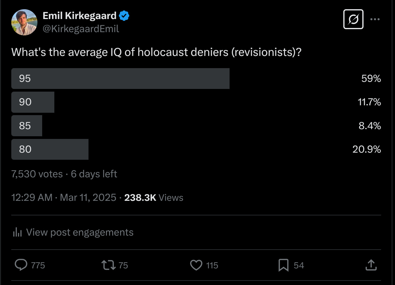 One doesn't really need to do these calculations specifically to know that the IQ is in that range because a moment's reflection would immediately tell you that holocaust denial is most common in the Muslim world because these are the most anti-Jewish people, and the mean IQ there is about 80-85, so one could simply adopt that as the guess and it would be approximately correct as well. That is what most people on Twitter failed to do, even some otherwise reasonable posters who replied to my poll.