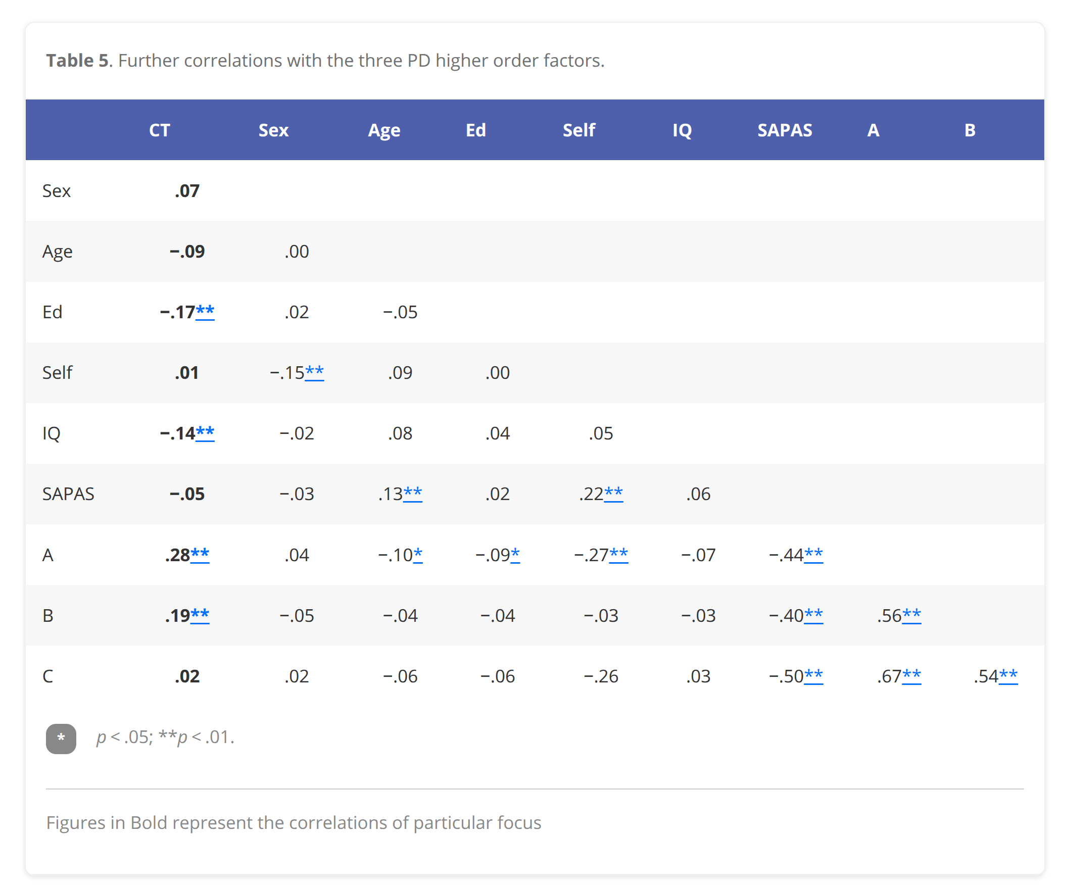 CT is conspiracy theories, which correlated -0.14 with IQ (-0.17 with education), 0.28 with cluster A and 0.19 with cluster B ("Clusters A (Odd and Eccentric) and B (Dramatic and Emotional) ... and Cluster C (Emotional)"). A correlation of 0.14 corresponds to about 0.28 d, or 4,2 IQ. But it's a 10-item IQ test, so adjusted for reliability, it would be larger, assuming reliability 0.70, it would be 5 IQ.